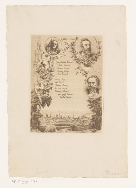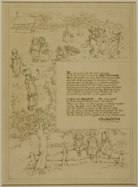 Curator: This captivating engraving before us, titled "To omslag med slynget lænkeronament med dyr til 'Halvhundrede Fabler for Børn' med skrift," was created in 1834 by Martinus Rørbye. It's held here at the SMK - Statens Museum for Kunst. Editor: It's striking! The density of interwoven creatures and foliage creates a wonderful sense of contained chaos, or perhaps dynamic balance. The stark lines really pop. Curator: Precisely. Rørbye's masterful use of line—a signature element of Romanticism—serves to delineate the complex, interwoven forms, creating a tapestry-like structure that speaks to the decorative arts tradition. The tight composition focuses the viewer’s eye, refusing to allow a restful escape. Editor: The menagerie of animals feels symbolic. What do these creatures signify? I detect foxes, bears, and what appear to be oxen... The animals, presented together with the interwoven foliage and lettering, almost form a medieval bestiary! Curator: The appearance is indeed quite evocative! The combination of text and image speaks to the oral traditions of fables. Within this intricate ornamentation, animals such as the bear embody strength, the fox cleverness, and so on, providing moral instruction embedded in popular understanding. Rørbye deftly intertwines cultural memory with natural forms, echoing and amplifying these established meanings for his intended audience of children. Editor: This really pulls into view the importance of the book and its potential impact on young minds being presented with these intricate patterns paired alongside tales of morals and folklore. There’s a naivete in some of the rendering of animals and their interlinking nature, making the piece evermore delightful! Curator: Absolutely. Rørbye captures a distinct synthesis here—marrying the formal elegance of line engraving with a warm sentimentality which characterizes so much 19th-century book illustration. The symbolic function is secondary only to the visual enjoyment derived from the composition itself. Editor: Indeed, it’s a testament to Rørbye's ability to seamlessly blend instruction with imagination. One lingers in the realm of forms, as if on the boundary of dream and awareness. Curator: Yes. A compact design offering expansive readings through its structured artifice.