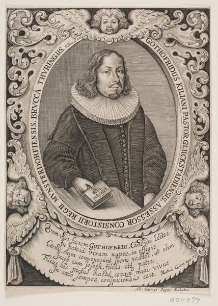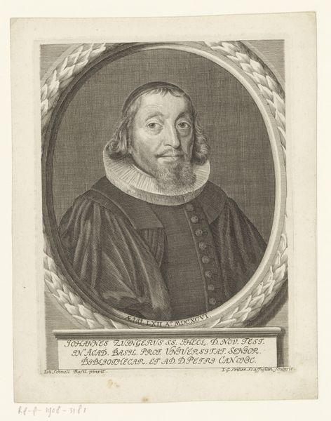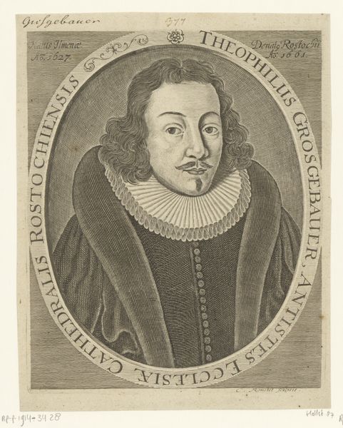 This is a portrait of Johann Affelmann at age 35, etched by Nicolaus Häublin. Dominating the composition is the intricate ruff collar. This isn't merely a fashion statement; it's a symbol of status, intellect, and moral rectitude. Consider how such collars have evolved from simple neck coverings to elaborate, almost theatrical, constructions. We find echoes of this in the stiff, formal attire of Roman senators, each fold and pleat speaking to power and authority. The ruff creates a visual halo around Affelmann’s face, a device seen in countless depictions of saints and scholars throughout history. This elevates him, imbuing him with an almost divine aura. It suggests that he is a man of considerable importance, set apart from the common masses. It’s a powerful statement about the sitter’s perceived place in the world, and the artist's intent in immortalizing him.