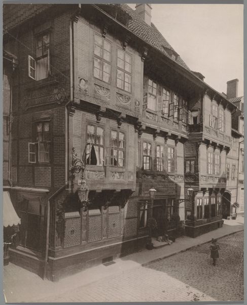 Louis-Rémy Robert captured this evocative photograph, "Village Scene, Brittany," with a paper negative sometime in the mid-19th century. The sepia tones and intricate composition draw us into a world where architecture and everyday life intertwine. Notice how Robert uses the strong diagonal lines of the building and cobblestone street to create a dynamic, almost theatrical space. The building's facade, with its detailed stonework and varied window treatments, presents a complex interplay of light and shadow. This meticulous attention to texture destabilizes any singular reading of the scene. The eye is drawn to the subtle contrasts between the rough stone and the smoother surfaces, emphasizing the materiality of the structures. Robert’s skillful use of perspective and careful arrangement of elements invites us to consider how photography can challenge our perceptions of space and representation. The image functions as a semiotic system, where architectural details and the arrangement of objects communicate deeper cultural meanings about place and history. Ultimately, the photograph offers not just a visual record but a complex meditation on form, texture, and the passage of time.
