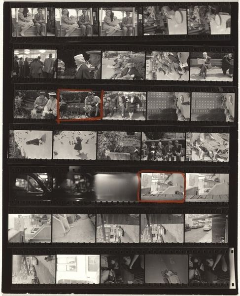 Editor: Here we have Robert Frank’s “Guggenheim 116/Americans 27--New York City,” possibly from 1955, a photography piece showcasing frames of a film. What strikes me is the raw, almost chaotic arrangement of these images – it feels like a glimpse into a stream of consciousness. What’s your take on this work? Curator: Frank’s contact sheet offers more than just photographs; it’s a political statement disguised as street photography. Each frame whispers stories of a post-war America grappling with its identity, consumerism, and racial divides. How do these fractured images speak to you about the American Dream, or perhaps, its unfulfilled promises? Editor: That's insightful! I initially saw chaos, but you're pointing to something deeper—a critical commentary. The varying scenes, from mundane cityscapes to candid portraits, create a fragmented narrative. Do you think Frank intentionally chose this medium to reflect that sense of fragmentation? Curator: Absolutely. Frank’s choice to present these images as a film strip disrupts traditional photographic narratives. It’s almost like he's saying that the "truth" of America isn't a single, clear image, but a collection of imperfect moments. Think about how this resonates with the Civil Rights movement brewing during this time. What stories might these seemingly random frames be trying to tell us about power, visibility, and exclusion? Editor: So it's not just a collection of images, but a deliberate challenge to the status quo. It makes you wonder what he was trying to say about who gets seen and who is left out. Curator: Precisely. And the roughness of the film strip itself, the imperfections, becomes a vital part of the message. It reminds us that history is never clean or simple, but a complex and often contradictory narrative pieced together from fragments. What have you discovered about this artwork by considering these ideas? Editor: I came in seeing a chaotic collection, but I’m leaving with a sense of how the arrangement critiques America, prompting discussions about who is included and who isn't. Curator: Exactly, seeing is only the first step. Understanding demands a look at who and what shapes these images.