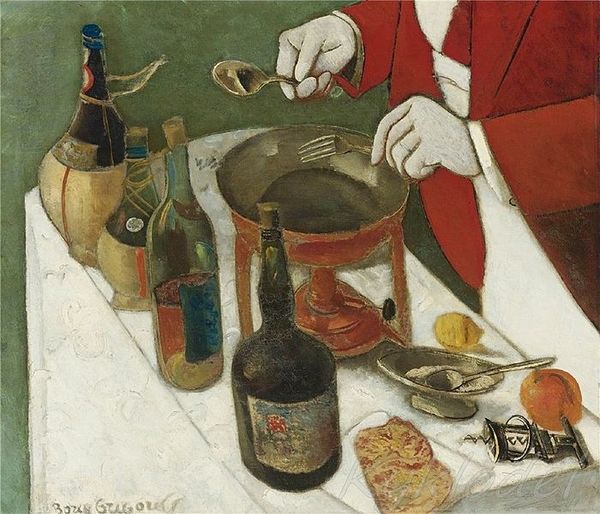 Curator: Oh, I find this Still Life so intriguing. Its attributed to Niko Pirosmani, although exact dates for his pieces are often elusive. Editor: Mmm, it has the kind of raw honesty that just stops you in your tracks, doesn’t it? Like a forgotten family snapshot, brimming with stories, and just a touch melancholic, no? Curator: Indeed. What strikes me immediately is its seemingly deliberate crudeness, almost as a kind of naive painterliness—an unrefined style with profound socio-cultural roots within the era and society that fostered such creation. The use of commonplace subjects also reflects that folk-art tendency to portray elements that are easily and widely relatable. Editor: Absolutely. There's an immediate feeling of a modest, intimate feast about to happen—a pre-celebration vibe, like before an Orthodox Easter, full of shared culture, history and personal significance. I'd bet this piece tells us something about what real meals looked like outside fancy drawing rooms in the time it was created. What do you think the lettering tells us? Curator: I believe they reference the holiday in question and likely offer blessings in a similarly religious sense. This, alongside the various meal staples showcased as almost central figures, definitely supports that reading. I can also appreciate Pirosmani depicting specifically lower-class customs, especially given the political contexts for working-class Georgians at the time. Editor: I almost get the sensation he wanted you to *taste* what you're looking at, to smell that Easter bread, and that slightly musty-basement wine... There is even fish present. Such bold rawness invites you right in there alongside them, almost in defiance of traditional academic sensibilities. Curator: That contrast is really at the heart of his appeal—defiance made beautifully palatable and publicly digestible. Its enduring legacy also offers invaluable cultural insights into what it means to recontextualize what fine art and the role of the artist are in general. Editor: Precisely. Art is often about bridging worlds, and with such unpolished directness, this artwork creates an intimate bridge between the highbrow and lowbrow elements of the then cultural climate. Curator: Indeed. Such synthesis truly solidifies its ongoing impact as well as its relevance to even modern artistic commentary. Editor: So here's to folk-art, to honest expressions and to never being afraid of things not so polished!