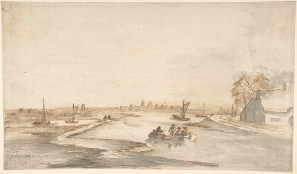 Curator: A delicate scene, this one. Made with ink on paper, Simon de Vlieger's "Meeresstrand, rechts fünf nach rechts segelnde Schiffe" translates to "Seashore, five ships sailing to the right on the right." What's your initial reaction to this work? Editor: Stark, in a way. There's this muted palette and such a broad view. And that stark simplicity really highlights the labor implied—fishermen pulling nets, sails catching the wind. You just know lives depended on every little detail depicted. Curator: Precisely. Seascapes, popular in the Dutch Golden Age, often served as powerful metaphors. Ships could symbolize hope, journeys, or even the human soul navigating the vastness of existence. The beach, though seemingly serene, also held the weight of coastal economies. Editor: It's fascinating how de Vlieger creates depth. The technique and medium itself, the very fine line drawing – all focus attention on human activity against this boundless background. Look how the beach materials in the front define that perspective. Curator: De Vlieger's focus here wasn’t just documentation; he seems interested in the universal theme of human engagement with nature. Editor: Definitely. And, practically speaking, access to quality ink, paper... these shaped what kind of art was even possible. Think about who controlled those resources, who profited. It changes how we view the "beauty" of this coastal scene. Curator: These coastal landscapes in the Netherlands held potent economic weight and meaning for its culture. Editor: Right. From the perspective of maritime trade and artistic movements, materials tell a bigger story, right? De Vlieger crafted an image loaded with the visual vocabulary of his time. Curator: The simplicity may deceive at first glance, but this "Meeresstrand" is rich in symbolic content, reflective of the dynamic interchange between labor, nature, and perhaps something deeper. Editor: Agreed. It makes you wonder about all the labor happening behind the scenes as well. That is where I'll keep pondering the artwork, anyhow.