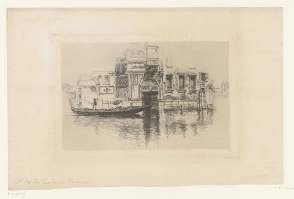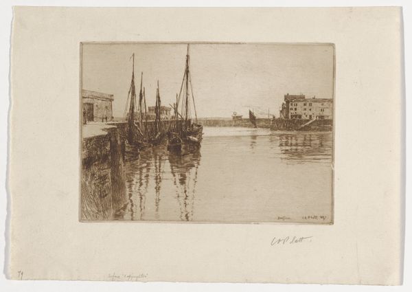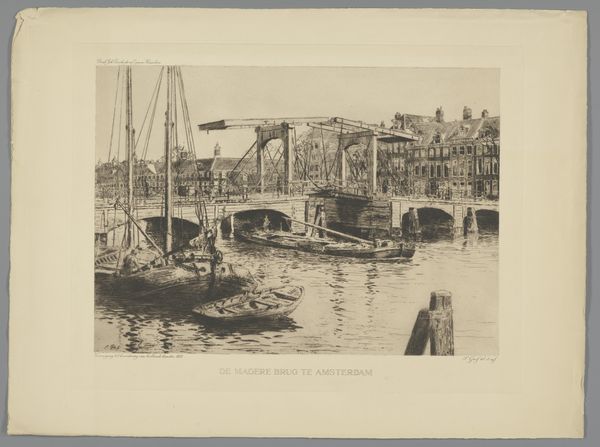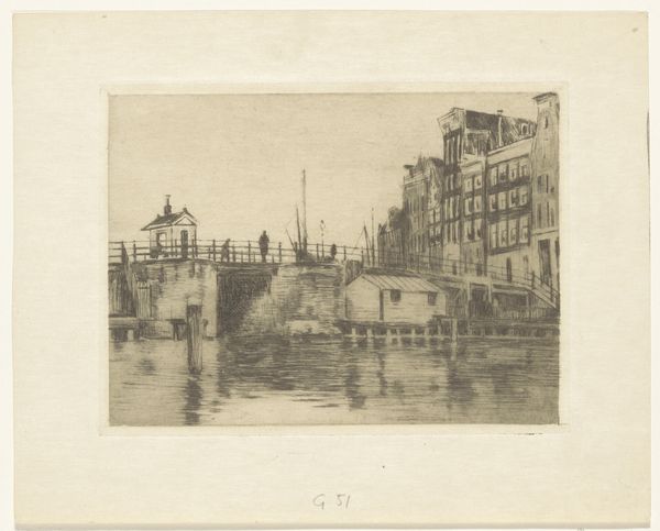 Editor: So, this is Willem Witsen’s "View of the Kraansluis in Amsterdam," from 1911, an etching printed on paper. It’s a really calming image; the reflection of the buildings in the water gives it such a serene feeling. What stands out to you about it? Curator: What immediately strikes me is the social and historical context of representing Amsterdam in this way. At the turn of the century, cities were undergoing massive transformations, grappling with industrialization and population growth. Editor: That’s true, there's definitely a sense of the everyday, capturing a normal day in the city rather than some grand historical event. Curator: Precisely. Consider the deliberate choice of subject: a functional drawbridge and modest buildings. Witsen avoids glorifying traditional symbols of power or wealth, opting instead to focus on the quotidian. In that sense, it mirrors the rise of social realism. It’s important to ask, though, to what extent is Witsen offering a neutral observation, and to what extent does he participate in romanticizing or even aestheticizing urban life? What do you think? Editor: That’s a good question! The etching technique does give it a nostalgic feel, even though it's depicting his present day. It feels like looking back at a simpler time. Curator: That "simpler time" is a construct though, right? These images helped to shape how people perceived the rapidly changing city. This romanticism, this visual language, it influenced policy, urban planning, and even tourism. Images like this are not passive; they’re active participants in shaping our understanding of history. Editor: Wow, I hadn't thought about it like that, the idea of the artwork actively influencing the future! I came in just seeing a pretty cityscape! Curator: Exactly! The politics of imagery. Food for thought!