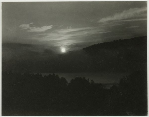 Editor: Here we have Alfred Stieglitz's photograph, "Lake George," created in 1922. It's a monochromatic landscape print, primarily in shades of grey. There's a brooding stillness to it; the geometric compositions between land and cloud give me a very calm but also dramatic mood. What strikes you most about this photograph? Curator: Stieglitz, a key figure in promoting photography as fine art, consistently challenged established art institutions through his work and gallery spaces. In "Lake George," the dramatic sky and its almost equal distribution of space with the more firmly planted earthly forms suggests a kind of spiritualist striving that was very characteristic of much art from this period that directly followed the trauma of the First World War. The scene almost flattens into abstraction. Does that abstraction align with your reading of the overall mood? Editor: Yes, definitely. The flatness contributes to the stillness and elevates it from being just a representation of a landscape into something more symbolic. It feels… almost like a symbolist painting but with the stark realism that only photography can capture. In that regard, to me the photograph almost argues with itself between being a representation and a commentary on it. Curator: That tension you observe is vital. Stieglitz, through his publication *Camera Work* and the "291" gallery, championed modern art, introducing European avant-garde movements to the American public. He helped introduce many Americans to modernism through photography by using "straight photography." Do you see any evidence of that artistic rebellion or tension in his other landscapes? Editor: I think so. Knowing about his efforts makes me see "Lake George" as more than just a pretty landscape; it's a statement about what photography *can* be. I realize I’m considering the social impact more, now, how it challenges norms. Thanks for offering that frame! Curator: Precisely. Stieglitz aimed to prove photography's artistic merit, forever altering its place within the established art world, and its place within public perception of that world. This piece allows us to consider photography's dynamic and somewhat precarious cultural placement, and what’s at stake in considering that place as unstable.