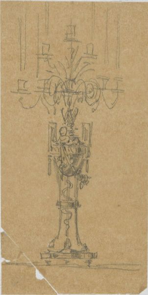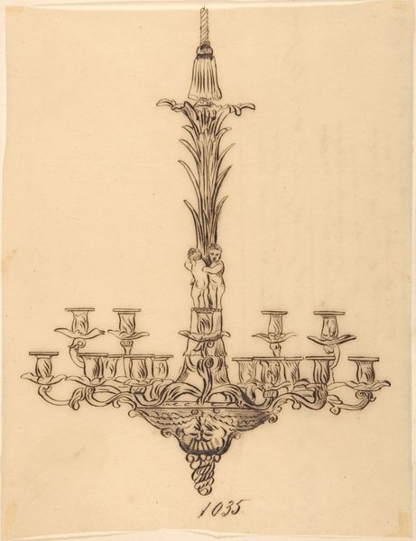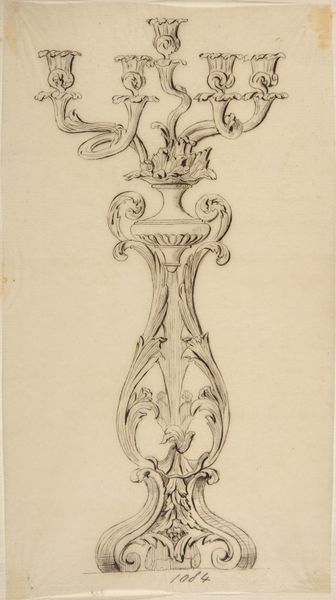 Editor: This is an anonymous 19th-century drawing, "Design for a Candelabra," held at the Metropolitan Museum of Art. The linear quality makes it look quite precise. What can you tell me about the historical significance of a design like this? Curator: This design embodies the 19th-century fascination with reviving historical styles, particularly Neoclassicism and the Rococo. Consider how the candelabra as an object was shifting in meaning, from solely functional to a signifier of status and taste within the rapidly growing middle class. The detailed drawings, often circulated as prints, served as aspirational models and tools for craftsmen adapting to industrial production. Editor: So it wasn't necessarily meant to be a unique artwork, but something more mass-producible? Curator: Precisely. Think about how the museum acquires and displays such objects. Is it as fine art, or as evidence of broader cultural trends in design and consumption? The very act of displaying it changes its status, right? It transforms a utilitarian blueprint into an art object. Notice also the almost aggressively ornamental flourishes--the swans, the leafy details. What might that suggest about the social aspirations of those who might own such an object? Editor: That makes sense. Seeing it displayed in a museum definitely elevates it. The swans at the base, now that you mention it, feel almost over the top! I initially just saw it as a drawing, but now I see it as part of this bigger shift in how objects were being produced and consumed. Thanks. Curator: And remember, the "anonymous" label itself invites a socio-historical question: Why are the designers and craftspeople behind such widespread aesthetic styles often uncredited by institutions, obscuring histories of labor and creativity? There is so much more here than just design; it reveals systems of taste.