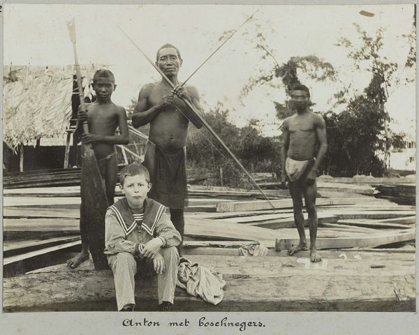 Curator: This intriguing photograph is titled "Portret van een onbekende man en jonge vrouw op de Mentawei-eilanden" – Portrait of an Unknown Man and Young Woman on the Mentawai Islands. It was taken between 1890 and 1897 by Christiaan Benjamin Nieuwenhuis and resides here at the Rijksmuseum. Editor: My initial reaction is one of subdued observation. The sepia tones lend a sense of history, almost voyeurism, as if peering into a world both distant and deeply human. The figures appear posed but retain a certain gravity, even a slight melancholy. Curator: It's hard not to project, isn't it? The photographic process of the time demanded stillness, yet they appear remarkably present. Nieuwenhuis' choice to depict them unadorned emphasizes the natural materials that they do use—their crafted jewelry, woven skirts and loincloths, and that simple thatched structure. This focus feels almost… revolutionary for the time. Editor: Absolutely. The image invites us to contemplate the production involved – sourcing the materials, weaving the fabrics, crafting the adornments. Each necklace bead probably took considerable labour. I am certain these ornaments go far beyond personal style: they display and constitute identity and its relationship to the earth. It transcends mere portraiture, offering a glimpse into the material realities and societal structures of Mentawai culture. Curator: Yes, and in that vulnerability – the lack of European dress, the visibility of their daily environment—we see both a deliberate recording of indigenous life and, potentially, an unwitting exposure of power dynamics inherent in the colonial gaze. Do you see how the light caresses her face, rendering the subject incredibly endearing, even to a contemporary viewer? I find it rather amazing. Editor: I think this tenderness highlights that material reality, though. It avoids romanticism and focuses instead on revealing the complex interweaving of culture and everyday living. Curator: It certainly makes one reflect on how photography, seemingly objective, is so often infused with the subjective intentions of both the photographer and the viewer, which shift in tone with time. Editor: Indeed. It forces us to examine our own roles in the consumption and interpretation of such images. Thinking about how labor intersects with identity is what makes me reflect on the modern legacies that connect and yet divide us.