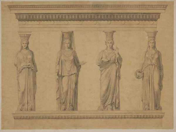 Curator: Before us is a charcoal drawing by Nicolai Abildgaard titled, "Halvrundt felt med tre runde kvindefigurer, de to yderste med skjolde, der synes at vise, at de fremstiller Norge og nordtyske lande (Stormarn og Ditmarsken?). Den midterste symboliserer formodentlig Danmark," created sometime between 1743 and 1809. Editor: My goodness, what a title. Even without understanding Danish, it speaks volumes. Visually, it strikes me as an odd mix of imposing monumentality, thanks to the grouping, and yet rendered in rather soft charcoal hues. It feels almost ghostly. Curator: Indeed, the ambiguity is potent. The semi-circular composition lends a classical feel, a deliberate nod to ancient friezes, but it's rendered with what could be seen as almost proto-Romantic sensibilities through this choice of material, as the chalk softens the forms almost into oblivion. Editor: Note the deliberate choice of figures, these idealized female forms holding shields inscribed to stand in as allegorical representations of nations, Norway, Denmark, and northern German territories. Abildgaard is playing with established iconographies but subtly undermining them. Are these guardians, rulers, or something else entirely? Curator: It’s not an anomaly in Abildgaard’s output. We observe an engagement with academic art historical painting traditions that emphasizes the socio-political moment by illustrating nationalism as imagined through personified symbols. Notice how they relate to each other physically in a moment that is not perfectly unified. There seems to be a disquiet between them. Editor: Exactly! This isn't just about aesthetics or refined composition. There’s an underlying commentary here, perhaps on the complex, sometimes tense relationship between these Scandinavian and northern German regions. It makes you wonder what kind of power dynamic Abildgaard saw during his lifetime, rendered onto this simple surface. Curator: Considering the Danish context of that period, it invites viewers to reflect on the allegorical implications embedded within what seems a purely formal exercise of Academic Art, even two centuries later. It suggests the importance of critical art historical methodologies for understanding what art accomplishes in social life. Editor: I agree. Its subdued palette and ghostly outlines challenge any easy reading. We begin with formalism and its structures that provide a sense of academic establishment before quickly delving into historical-cultural relationships that challenge this stability, offering more than what might be suggested at first glance.