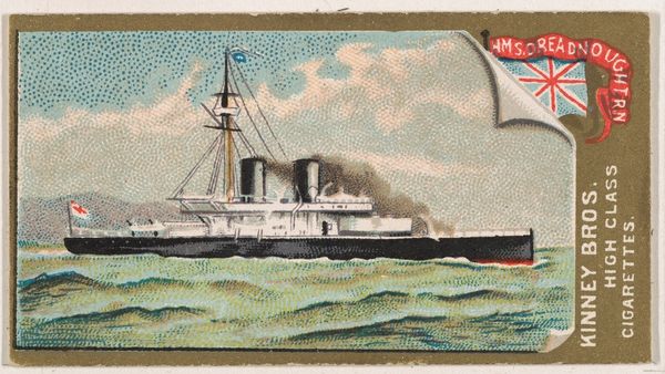 Curator: This piece, "U.S.S. Texas, from the Naval Vessels of the World series" dates back to 1889. It’s a print, drawing, and watercolor, issued by Kinney Bros. Editor: It has such a… quaint, almost nostalgic feel. The rendering of the ship on what appears to be choppy water and a small American flag is so charmingly executed. The image itself is a fascinating composite object, since it serves as both art and advertisement. Curator: Absolutely. These were, in essence, trade cards, included in Kinney Brothers' cigarette packs. Their mass production positioned them within a burgeoning culture of collecting, particularly around representations of industrial progress and military might. The print, through its cheap materials and association with tobacco consumption, challenges our standard art boundaries. Editor: That tension is palpable. It also functioned as a propaganda tool. The image, while decorative, also promoted a specific image of American naval power. This little card tells a grander story of how companies aided in nation-building and defining U.S. identity. What do you make of it using watercolor, traditionally associated with fine art? Curator: I believe that using watercolor in mass-produced commercial objects brings art closer to everyday life and acknowledges the aesthetic labor of skilled illustrators who produced designs on behalf of businesses. Watercolor as medium is well-suited for the demands of reproducing multiples because it is relatively easy to reproduce! The drawing, the print… they’re all essential for dissemination. Editor: A clever strategy by Kinney Bros. It made this image ubiquitous. Thinking about its role in society reveals how cultural values, and commercial strategies shape our understanding of national strength. The “U.S.S. Texas” transformed from simply a ship into an icon during the late 19th century. Curator: That makes me think about who gets to decide the difference between a collectible and a legitimate piece of art, and that’s dependent upon market value and where and how it is being consumed. Editor: It really is a great microcosm of that very argument. Well, I certainly won’t look at old cigarette cards the same way again. Curator: Nor I. I’m struck once more by the complex economic system by which artistic work reaches the masses.