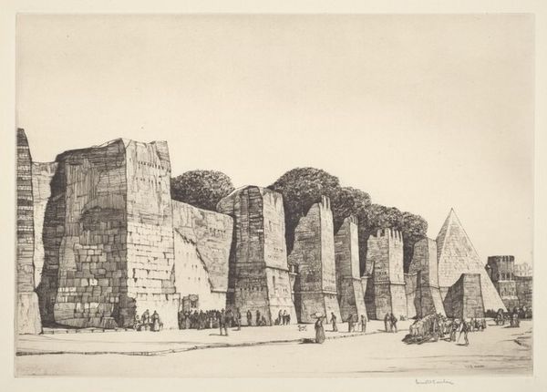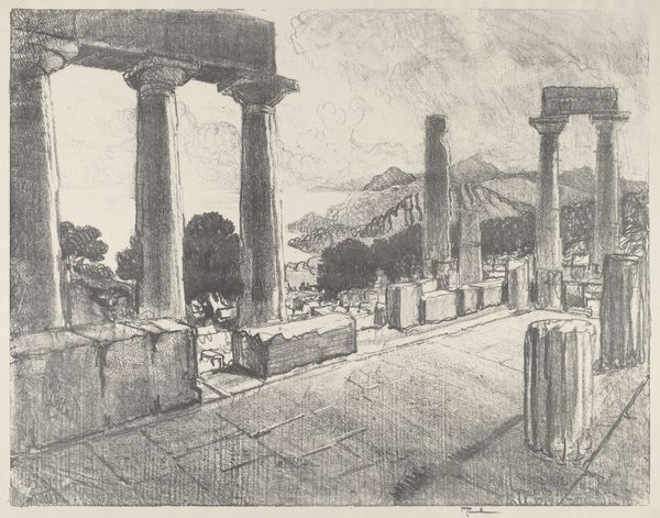 Curator: Joseph Pennell’s print, "Columns of the Temple of Juno, Girgenti," created in 1913. The work offers us a glimpse of the Temple of Juno ruins in Agrigento, Sicily. Editor: Wow, there's such a powerful sense of melancholic grandeur here. The ruined columns reaching up into the sky, sketched with these incredibly active pencil lines – it feels like the stones themselves are whispering secrets. Curator: Pennell's work is particularly interesting because he was known for depicting architectural subjects and cityscapes with a modern, almost industrial sensibility. This image of the Temple of Juno departs slightly in favor of a deeper romanticism. Editor: I agree. It almost has a dreamlike quality. Look at the heavy contrast, with its solid dark pillars looming as shadows that draw your eyes into its mysterious atmosphere, inviting reflection. It reminds us of time’s relentless, transforming hand, on both nature and society. Curator: He produced this image, which feels traditional in some ways, in an era where new avant-garde artistic movements such as cubism were already in full bloom. The Temple of Juno was and remains a symbol. We see that the romantic aesthetic surrounding ruins can serve the symbolic function to legitimize power structures. In the early 20th century, ruins and landscapes began to transform into political and cultural icons and commodities. Editor: True, though for me it comes back to that intense emotional reaction to something aged, crumbling, beautiful and sad. A primal story. You know? Standing here imagining the builders, priests, celebrants… then the slow decline and inevitable collapse of human glory! Melodramatic, I know. But, that's art isn't it? Curator: Exactly. Pennell offers us a document but he also provides the feeling. This pencil drawing then opens to something larger, some deeper connection between past and present. Editor: Definitely. You walk away pondering what survives and the nature of art's witness to all that vanishes.