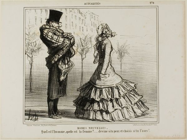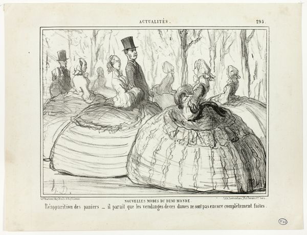 Honoré Daumier made this lithograph, "Modes du printemps de 1855," using a greasy crayon on a stone matrix, a process that allowed for the mass production of images for popular consumption. The print captures women in voluminous dresses, their elaborate construction hinted at by the frantic, scribbled lines of the lithographic process. The exaggerated ruffles and skirts suggest a fashion trend taken to its absurd extreme. What I find fascinating here is the link between image-making and industrial production. Lithography, as a reproductive medium, perfectly mirrors the mass production of textiles and fashion items during this period. Daumier’s work implies a critique of both – the relentless churn of new styles, and the labor involved in creating them, effectively lampooning consumer culture. By using printmaking to comment on fashion, Daumier blurs the lines between art, craft, and social commentary, reminding us that all forms of making are deeply intertwined with the social and economic forces of their time.