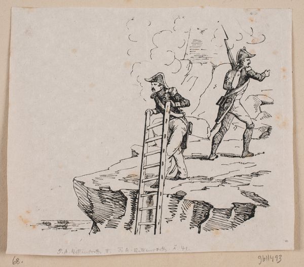 Editor: This is "Haagse Bos en twee jagers" by Johannes Tavenraat, a pencil drawing from 1873 at the Rijksmuseum. It seems like a candid snapshot. I’m drawn to the contrast between the clearly defined figures and the looser rendering of the forest itself. What do you see in this piece, considering its historical context? Curator: Well, focusing on the role of landscape art in 19th-century Dutch society, this drawing presents a fascinating insight into the changing relationship between humans and nature. The figures, the hunters, suggest human dominion, yet their diminutive scale compared to the forest hints at something else. What statement might Tavenraat be making about industrialization and urban sprawl by depicting the vastness of nature in this way? Editor: So you are thinking this piece highlights this shift in power dynamic during the rise of factories, railroads and the like? I mean, you might not know this, but when I look at this I simply think the forest is a calm escape. I haven't considered the "power" of man over nature at all. Curator: Precisely. This tension, this yearning for nature in the face of modernization, becomes a potent theme throughout the nineteenth century. The “calm escape” you identified – is this simply a personal feeling, or could that also reflect a longing that many in the rising urban middle-class of the time may also have been experiencing, shaping a specific way this artwork may have been consumed by the public back then? Editor: I hadn't thought of it that way! Seeing art as a reaction, or even a refuge from these broader social forces makes so much sense. Curator: Exactly. So this drawing captures a fleeting moment but also resonates with larger societal shifts, revealing how art reflects and shapes our understanding of the world around us. Editor: I appreciate that. Now I know to think about what these art pieces actually meant to the audiences of the time! Curator: And hopefully this conversation has added another dimension to your viewing. I too learned something new from your observations.