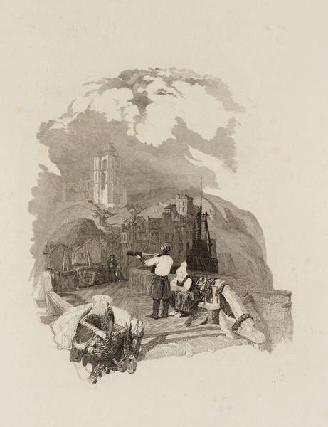 Editor: So, this is "Old Shop in Our Street" by Henry Duff Linton. It's a very detailed print. It almost feels like stepping back in time. What strikes you most about this image? Curator: The image speaks volumes about class and labor. Notice the figure weighed down with goods versus the shop's implied owner. It's not just a street scene; it's a snapshot of societal power dynamics. What do you think about the implied wealth disparity? Editor: That's a powerful point. I hadn't considered how the composition emphasizes that difference. Curator: Linton subtly reveals the social fabric of the time. Art isn't just about aesthetics; it's a mirror reflecting our collective history. Editor: I'll definitely look at art with a different perspective now. Curator: Exactly, art can make us confront uncomfortable truths.