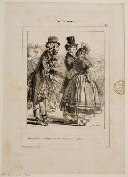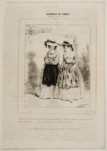 Curator: This lithograph is by Honoré Daumier, titled "The Delegates of the Central Socialist Club…" It is now part of the Harvard Art Museums collection. Editor: Gosh, they look so…flustered! It’s like they’ve just been caught doing something scandalous. Curator: Note the strategic use of chiaroscuro. Daumier uses light and shadow to create depth, guiding the eye to the central figure, but also drawing attention to the expressive faces. Editor: The figure on the left is all suspicion, while the one with the newspaper is peeking over it like a naughty child. It’s terribly funny, actually. Curator: These details contribute to Daumier's broader social commentary on the political landscape of his time. The print reveals tensions between social ideals and individual perceptions. Editor: It also feels like a peek into a private moment—like witnessing a juicy piece of gossip. It leaves you wondering what those women are really up to. Curator: Precisely, and through formal analysis, we uncover the complexity of Daumier's layered satire. Editor: Absolutely. Now, if only we could decipher their little secret!