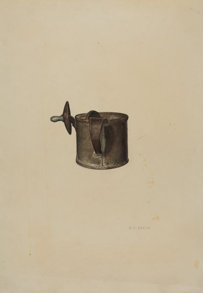 Curator: This watercolor and charcoal drawing, created around 1939 by Daniel Fletcher, depicts a rather austere-looking teapot. What are your first thoughts? Editor: It's so somber, almost oppressive. That square shape combined with the muted color palette gives it an incredibly weighty presence. It reminds me a little bit of some Depression-era still life photography in terms of that heavy mood. Curator: Indeed. Fletcher created this work in a specific sociopolitical landscape. We might consider how the stark, utilitarian design reflects a turn toward functionalism, prioritizing usefulness over frivolous aesthetics. Perhaps this signals an era valuing efficiency and practical design. Editor: That's an interesting angle. Looking at the materials—watercolor and charcoal on paper—highlights the accessibility of artmaking during this time. The artist wasn’t using precious materials. There’s an echo of making-do there, a certain resourcefulness dictated by the conditions of production. And also the question arises of who owned the depicted teapot? Whose table was it set on? Curator: Those are compelling questions! We should also consider the gaze present here. By immortalizing this seemingly mundane object, what statement might Fletcher be making about labor, gendered labor specifically? Teapots and the rituals of tea were frequently associated with domesticity. Was Fletcher acknowledging or even critiquing those associations? Editor: Definitely a question to consider, though the very regular cubic form strikes me more in line with early modernist machine aesthetics. Maybe the act of representing such a humble, everyday item grants dignity to routine labor and challenges a traditional hierarchy where craft and design might be considered "lesser" arts. Curator: It highlights a tension then, doesn't it? Between mass-produced object and artist rendered individual. Thank you for contributing so much material insight into understanding the importance of art making that makes art that seems insignificant on the surface. Editor: The tension makes this image so interesting. The art forces us to see labor is the most important work. This dialogue with art always leaves you with more to consider.