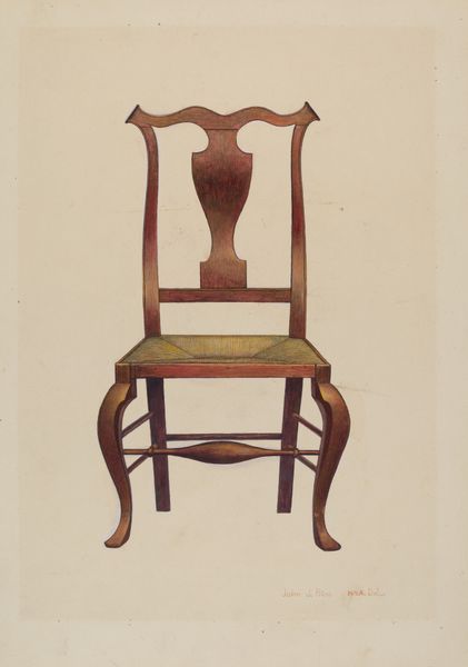 Editor: This is Charles Squires's "Side Chair" from around 1937, made with pencil and coloured pencil. It's a straightforward depiction of a decorative chair, almost like a furniture blueprint. What catches your eye about this particular piece? Curator: It's interesting to consider this drawing as an artifact related to furniture production. Squires likely wasn't creating "art" in the traditional sense but documenting or proposing a design. Think about the labour involved, the access to materials, the social status implied by this chair design in the 1930s. What was being consumed, and by whom? Editor: So you’re focusing less on the chair itself as an object of beauty, and more on its place within a system of production and consumption? Curator: Exactly. This image provides clues about the socio-economic context of the time. The precise lines, the choice of materials—pencil and coloured pencil, not paint or other ‘high art’ media—suggest a functional purpose, not necessarily an aesthetic one. What does that tell us about the artist and their potential role? Editor: I hadn't considered it that way. I guess I was focused on the chair's design elements. The carving, the upholstered seat. Curator: And those details are important! But as materialists, we need to ask: Who had access to this kind of luxury in 1937? Who made it, and under what conditions? The drawing, then, becomes a portal to understanding the historical relationships of labour, capital, and taste. Editor: That makes me think about how mass production changed things. Would a drawing like this still be relevant after mass-produced furniture became more common? Curator: A great question. The methods and value placed on handcrafted items changed drastically as mechanized production became the standard. We can interpret this drawing as a window into a specific time of American history when artisanal methods were getting replaced by industrial ones, deeply impacting culture and manufacturing of furniture and design itself. Editor: It's fascinating to think about the object’s place in a system instead of viewing it as an isolated artwork. Thanks for changing my perspective on this drawing! Curator: And thank you for your thoughtful questions. Looking at art through a materialist lens can really deepen our understanding of history and culture.