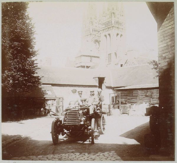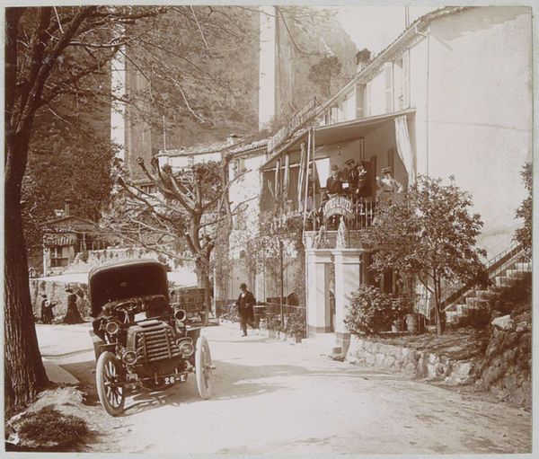 This vintage photograph, "Gezelschap met twee automobielen op een binnenplaats" captures a scene of early automotive luxury, its sepia tones framing two cars in what's thought to be the courtyard of a French country house. The composition is dominated by the architectural structure behind, nearly engulfed in verdant foliage, which creates a striking contrast with the mechanical precision of the vehicles. This tension between nature and technology highlights a moment of transition, mirroring the broader cultural shifts as modernity began to take hold. The staff are placed almost asymmetrically, drawing our eye across the courtyard and emphasizing the depth of the space. The photograph's charm lies in its ability to capture a specific moment in time, a blend of human presence, technological advancement, and natural overgrowth, inviting us to consider how progress intersects with the past.