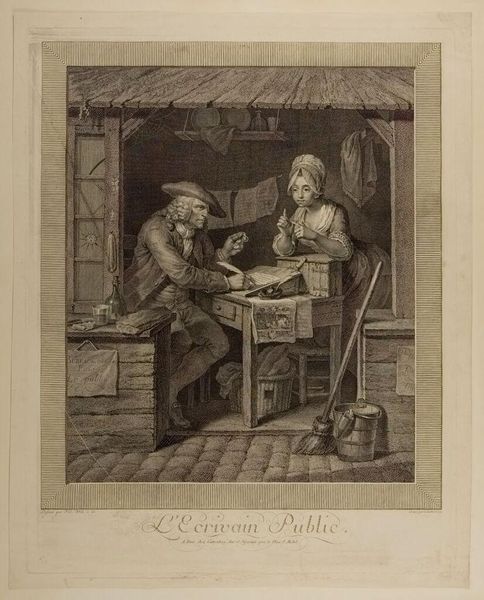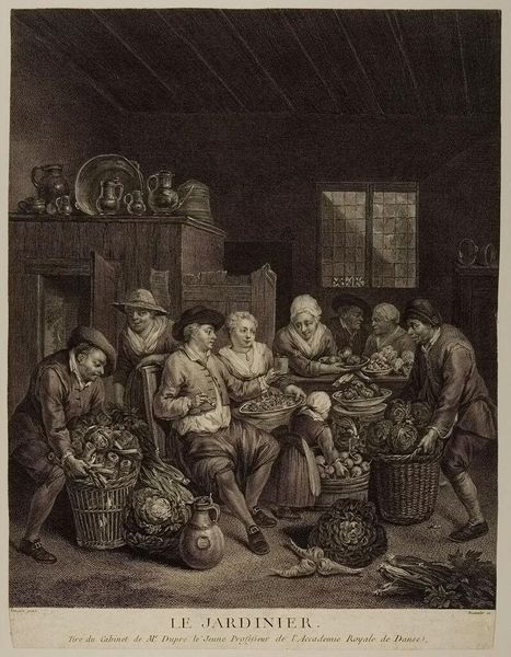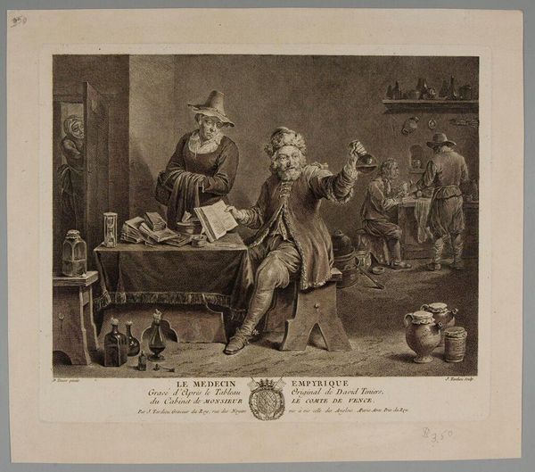 Editor: This is Jean Daullé's "The Flemish Surgeon." It doesn't have a specific date, but Daullé lived in the 18th century. The etching is incredibly detailed. What's your take on its depiction of labor? Curator: Look closely at the tools displayed. The arrangement emphasizes the materiality of the surgical practice. The setting, almost domestic, challenges the perceived high status of medicine by grounding it in everyday life and labor. How does this demystification affect your understanding? Editor: I see what you mean; the ordinary setting really brings it down to earth. It's interesting how it connects skill with craft in a tangible way. Curator: Precisely! Reflect on the social context: Who had access to such care, and what does the print's circulation tell us about consumption and class? Editor: I hadn't considered the audience. It's a good reminder to think about who would have owned and viewed this. Thanks!