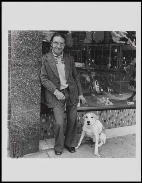 Curator: This is Keith Arnatt's "Walking the Dog," part of the Tate Collection. I find it wonderfully understated, almost deadpan. Editor: The monochrome tones really emphasize the starkness of the setting, there's a sort of working-class ennui hanging in the air, wouldn't you agree? Curator: Perhaps. I see a quiet dignity, a man and his dog, both posed against a rough stone wall, each with their own silent thoughts. The purse he's carrying seems almost defiant. Editor: Yes, the purse disrupts the heteronormative conventions we might expect. It challenges our assumptions about gender roles and everyday performance. Curator: Absolutely. It's as if Arnatt's saying, "Here I am, eccentricities and all." There's a gentle humor to the work. Editor: But also consider the dog’s position, its gaze; its very existence is entwined with human systems of power and control. Curator: True, it makes you ponder the nuances of those interspecies relationships. It's deceptively simple, layered with subtle observations. Editor: A slice of life framed just so to provoke deeper questions about our place in the world. Curator: Indeed, a quiet moment captured that continues to speak volumes.