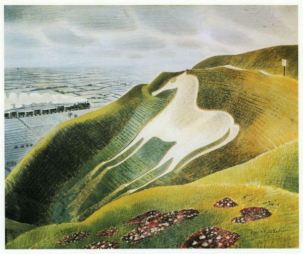Curator: The watercolor piece before us is "The Causeway, Wiltshire Downs" created by Eric Ravilious in 1937. Ravilious captures a uniquely British landscape in this artwork. Editor: It's striking how tranquil the image feels. The gentle curves of the hills and the soft light give off a very peaceful, almost nostalgic atmosphere. Curator: Indeed. Ravilious was deeply embedded in the interwar British art scene, responding to a strong cultural need for images of national identity and the countryside. He offers a vision of the pastoral, untainted by industrialisation, aligning with a romantic longing for simpler times. Editor: And he employs such a delicate hand in the execution. You'd almost think it was effortless, but you can see the precision in the layering of colours and the controlled washes of watercolour that define the form of each hill. Curator: Observe how the winding causeway acts almost like a symbolic pathway through time and history, carving its way through the undulating landscape. Such paths always have resonance as both physical realities and spiritual metaphors. Editor: Absolutely. The way the path snakes into the distance really draws the eye into the heart of the landscape. It subtly suggests journeys, both literal and perhaps metaphorical, the sense of an adventure and what may lie around the bend. But there’s also an element of solitude... perhaps Ravilious is encouraging each viewer to project a personal narrative into the landscape. Curator: Note the light as a symbol. See how the illumination pours from above onto certain sections, as though divinity is about to intervene or make an announcement. In this moment, Nature itself might reveal a hidden wisdom. Editor: It also presents a complex dynamic of national identity caught in between rapid modernisation, industrial progress, and nostalgic longing for a timeless rural setting. Curator: Thinking about it that way emphasizes how artworks like "The Causeway" can serve as historical anchors that give visual form to abstract ideas about community, memory, and values. Editor: That gives me so much to think about. Thanks. Curator: Indeed, every layer holds something new for us to see.