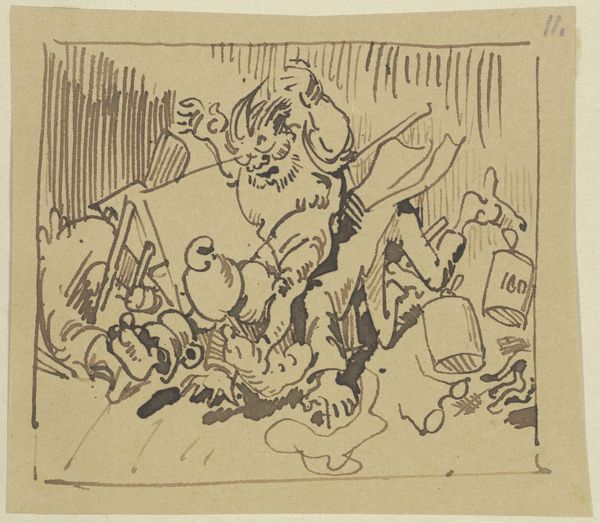 Editor: Here we have Wilhelm Busch’s "Mit kühnem Mut aus seinem Bett Schwingt sich der Turner Hoppenstedt", created in 1871 using ink. It's a really quirky drawing. There's something almost grotesque, but funny about it. How do you interpret this work? Curator: This seemingly simple drawing allows us to unpack broader societal commentaries prevalent in Busch’s time. Think about it – the Industrial Revolution was in full swing, deeply impacting German society. Busch, through figures like Hoppenstedt, often satirized the emerging middle class, their aspirations, and sometimes their follies. Does this drawing, perhaps, present a caricature of bourgeois ambition, literally "swinging" into action with clumsy eagerness? Editor: That's an interesting point. So you're saying it’s not just a funny drawing, but a critique of social climbing? The ungainly pose and the exaggerated features could be mocking a certain type of person? Curator: Precisely! Consider the cultural context: caricature and satire were potent tools for social and political commentary. Busch's work, while humorous, often poked fun at authority, social norms, and the changing dynamics of German society. Ask yourself: who is Hoppenstedt? What does his "courageous" leap from bed signify in a rapidly modernizing world? Editor: It makes me wonder if Hoppenstedt represents the anxieties and absurdities of a society in flux, striving for progress but often tripping over itself in the process. The humor is almost a disguise for deeper societal anxieties. Curator: Exactly. And that tension between humor and underlying social critique is what makes Busch so compelling. It allows for a broader interrogation of identity, class, and societal expectations. Editor: I hadn’t considered it in that light. I was too focused on the funny drawing. Thanks! Curator: It's all about understanding the many layers within art and reflecting on the society from which they emerge.
