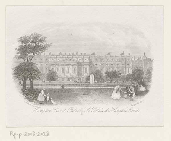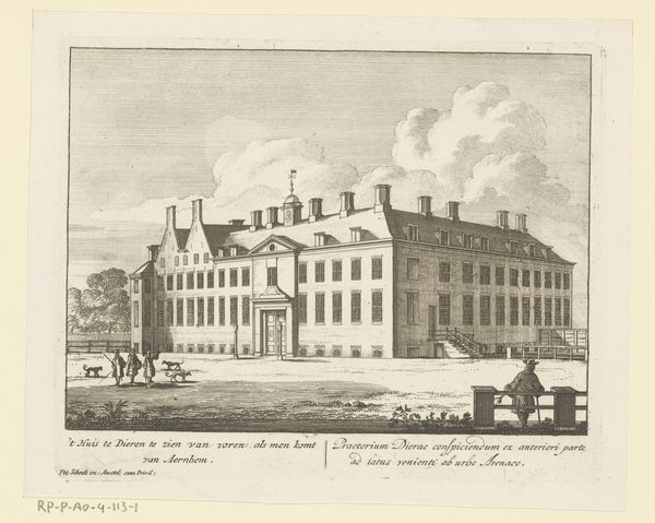 Editor: We're looking at "Koninklijk Paleis in Amsterdam vanaf de westzijde gezien," an etching and engraving made sometime between 1826 and 1839 by J.B. Clermans. It's got this lovely, almost dreamy quality. It feels a little bit like stepping back in time, wouldn't you say? What leaps out at you when you look at this print? Curator: Well, it whispers tales of Amsterdam’s evolving identity, doesn't it? It makes me ponder what it truly means to capture a place. Clermans wasn't just etching stone and mortar; he was giving permanence to a fleeting moment in time. Don't you find that prints offer such a unique opportunity to immortalize a perspective? What does this cityscape evoke in you? Editor: That’s beautifully put. It makes me wonder about the daily lives of people who lived around the palace back then. Were they aware that they were witnessing history in the making? Curator: Precisely! Look at the small figures dotted along the foreground – almost like ants bustling about their day. And the carriage, a signifier of progress and wealth in the 19th century. These are intentional juxtapositions to remind us of the ever-changing flow of life against the backdrop of enduring architecture. Does the palace seem imposing, or is it softened by the quotidian life unfolding around it? Editor: I think softened – the details make it human-scaled. Seeing this has shifted how I see historical cityscapes. It’s not just about grand buildings but about capturing the pulse of everyday life. Curator: Indeed. It reminds us that art, much like a city, is a living, breathing narrative, ever open to interpretation and re-evaluation. It’s fascinating how much we can read in a simple scene.