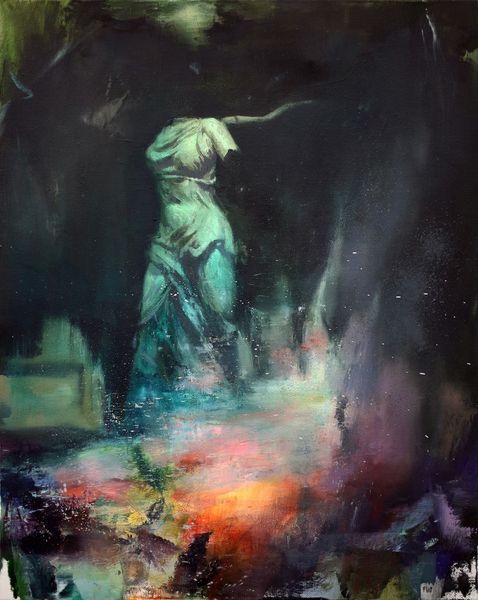 Curator: What catches my eye immediately about this painting is how the figures seem to be emerging from a sort of dreamlike fog. Editor: Exactly! The way the forms sort of dissolve and re-materialize gives it that feel. What’s the piece called? Curator: This is "The World Between," a 2016 acrylic on canvas work by contemporary artist Joshua Flint. It's interesting how the artist uses acrylic in this way. The application is both translucent and opaque at once. Editor: It makes me think of memory. Like fragmented glimpses into the past, refusing to quite solidify into something concrete. It feels so fleeting and… ethereal. It makes me almost nostalgic, which is odd, considering I don’t even know what I am looking at. Curator: The faceless figures intensify that feeling, doesn’t it? I notice how, although they're individuals, they almost blend, which could evoke a sense of interconnectedness that transcends individual identities. Perhaps touching upon our shared human experiences that time obscures. Also, the positioning of these figures is deliberate. Note the individual pulling the sheet or blanket—she seems to guard or hide, as two more are inert below. This suggests relationships: guardianship, caregiving. But what event has just occurred, one is compelled to ask. Editor: Yeah! I see how that central figure interacts with those who seem… unconscious. I like what you say, "obscured," not dead. And then there’s the third figure, in the top right, that you just clocked. The whole composition, combined with these roses throughout the piece, carries such weight. The flowers hint at both love and transience, the temporary beauty, which makes this image so poignant. It's almost cinematic. I find myself inventing a story about these people, these… players. Curator: Yes, "cinematic" indeed! That highlights an underlying narrative structure. A memory unfolding or a myth being reenacted. The absence of distinct features may allow each viewer to project their own story, their own emotional history, onto these figures. They act as containers for our shared experience, allowing this singular narrative to transform into a shared experience. It really shows that Flint's painting isn't just depicting an image. It evokes entire psychological landscapes, does it not? Editor: Absolutely. It's amazing how one image can act like a Rorschach test. Joshua Flint manages to convey so much ambiguity with so few concrete details. I really enjoyed letting it unfold this way.
