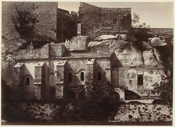 Curator: Standing before us is Eugène Constant's "Tempio della Pace," a gelatin silver print made between 1848 and 1852. The image captures a section of the Roman Forum. Editor: My initial thought is that the structure, while monumental, seems almost skeletal—as if time and weather have conspired to reveal its fragile core. There is an incredible contrast of shadow and light. Curator: The Roman Forum itself holds immense symbolic weight, serving as the epicenter of civic and religious life in ancient Rome. To see it captured in this nascent stage of photography, almost as an artifact of history, heightens that impact. What visual cues lead you to interpret it as skeletal? Editor: The exposed brickwork, the fragmented arches, the vegetation clinging to the ruins – these all contribute to the sense of decay and reclamation by nature. It whispers of the inevitable transience of human endeavors, which is powerful when considering its status as photography. Curator: Exactly. Constant’s choice to document the Temple of Peace—a site initially intended to represent Roman imperial power—underscores a narrative about power, and also about historical memory and cultural continuity, how our symbols are passed from one generation to the next and modified, reimagined… Editor: Which also underscores the political dimension; photography here transforms into a tool to not just record, but interpret history. How might the social context of its display have shaped public perception of the Roman Empire in Constant's time? What meanings were ascribed to Rome as the former "center of the world" by different audiences? Curator: Those questions are exactly why an artwork such as this matters—it invites the viewer to not only look at, but into history, examining the many, often contradictory, facets of what it means to both create and remember the world. It's quite fitting that the passage of time seems literally etched into the stones that the photographer has managed to capture. Editor: Indeed. A compelling visual document that really captures the cyclical nature of empires and iconography, both created and inevitably transformed or forgotten.