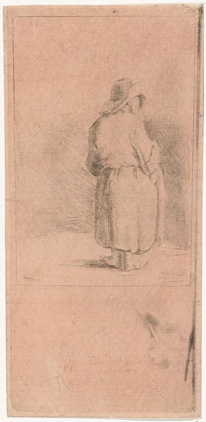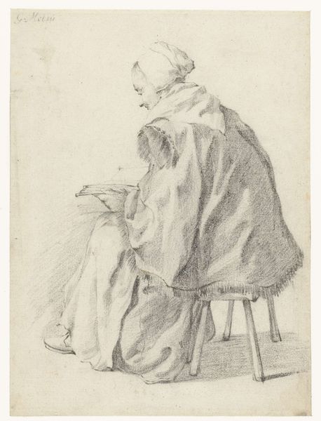 Editor: This is "Sitzender Mann mit Kappe, vom Rücken gesehen," a drawing by Georg Melchior Kraus, created around 1765 to 1769. It’s done with some kind of dry media on paper and is currently housed at the Städel Museum. It has a very…contemplative mood. What stands out to you? Curator: I see a wealth of inherited symbolism in the way the man is portrayed from behind. Think of "the gaze," so central to art history. By denying us that direct visual engagement, what power dynamics are at play? Does his cap suggest a specific role, a uniform perhaps? Editor: I hadn’t thought of that. The cap definitely gives him a certain air. So you see his turned back as a kind of visual cue? Curator: Precisely! From antiquity, turning away signifies retreat, perhaps a rejection. Yet, he's seated, grounded. Is this then a moment of quiet reflection, an internal turning away? Rococo artists often played with such ambiguities. Are we intruding on a private moment of despair? Editor: Hmm, that makes sense. The Rococo style… wasn’t it all about frivolity? Why the melancholy here? Curator: Aha! Here is the beauty: even in moments of perceived lightness, shadows persist. Could this drawing be a quiet critique of that very surface-level existence, suggesting a longing for something deeper, a wrestling with existential thoughts beneath the frills and lace? Or is the image simply the artist experimenting with academic study and portraiture traditions, adopting the visual codes of the gaze? What do *you* think? Editor: Wow, I never would have looked at it that way. Now I see how loaded such a simple image can be with so many cultural layers. Thanks! Curator: Indeed, these visual languages offer glimpses into past states of mind, still potent today.