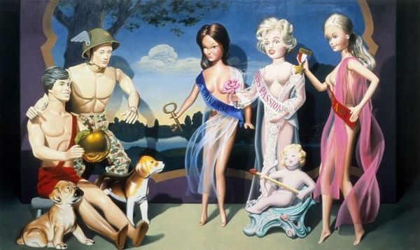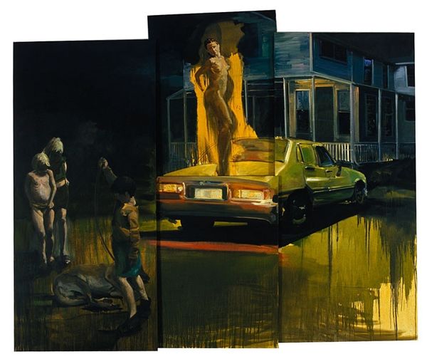 Curator: Arsen Savadov's "The Snow Queen," realized in 2017 with mixed-media, offers a jarring yet meticulously constructed composition. What are your initial impressions? Editor: Chaos, beauty, and death, all intertwined. There’s something deeply unsettling yet alluring about this strange garden party gone awry. The ballerina seems to be the eye of this aesthetic storm. Curator: Precisely. Consider the juxtaposition of elements. The central ballerina, paired with the mask she cradles, presents a figure seemingly detached. This compositional tension, where contrasting forms exist in spatial proximity, becomes key. Note the adjacent massive ice cream cone and its subtle echo in her white dress. Editor: It's an incredibly rich tableau, brimming with symbolic potential. The figure of the ballerina certainly hints at a sort of tragic innocence or perhaps forced perfection, the mask concealing true feelings. The dead birds add to a general sense of mourning and melancholic passing. What do the discarded books suggest to you? Curator: The books introduce another plane of narrative suggestion, furthering a sense of destabilized order within this pictorial space. Their placement–open, abandoned–disrupts their expected functionality, which contributes to an atmosphere that seems surreal and unresolved. But what does the garden as a whole signify in this symbolic order? Editor: The garden seems to embody an idyllic world infiltrated by corruption. The luxury car and manicured flowers present signs of contemporary wealth and beauty; however, juxtaposed with death and emotional distance, there's a commentary on contemporary values gone awry. The large size of the cone further suggests hedonism or imbalanced consumerism. Curator: Interesting; I would suggest that one not neglect the painterly technique, though. Observe how Savadov navigates from sharp focus to deliberately blurred areas to further guide the eye, while his masterful use of light renders texture with almost hyperreal quality. Editor: I agree entirely. Looking closely at "The Snow Queen" one sees a cultural mirror reflecting the frailty of idealized beauty in a world increasingly out of balance. It provokes many emotions and unsettling ideas about where we are heading. Curator: A rich combination of pictorial space and fragmented meanings is generated here that one does well to unpack through structured analysis, even if final interpretation is hard to determine. Editor: This artwork reveals just how artists create lasting images, capturing both beauty and unease, inspiring conversation long after the initial viewing.