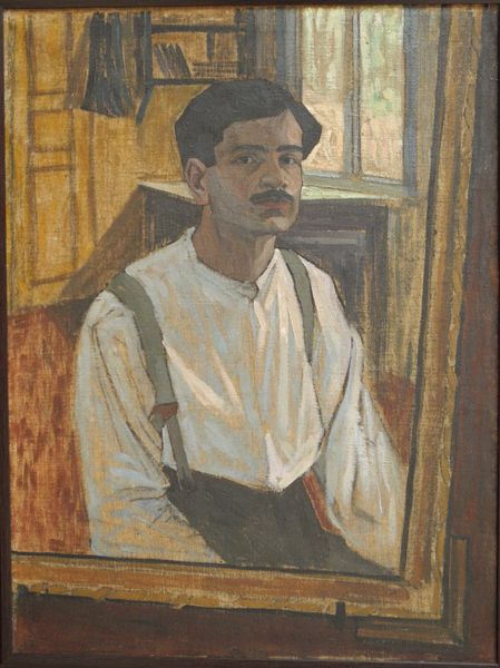 Periklis Vyzantios painted this self-portrait, in what looks like oil on canvas. There’s a real directness in the way he’s gone about it, with visible brushstrokes and a limited palette, mostly monochrome shades. This simplicity gets right to the core of what it means to make a painting – a process of layering and building up form with humble materials. Look at the texture in his white shirt. It’s built up with thick, opaque strokes, capturing the way light catches on the fabric. You can almost feel the weight of the paint, like the real weight of the shirt on his body. Notice that the background is quite dark, which makes the white pop. The way he has painted his fingers, tucked into his pocket, somehow gives me a clue to his whole attitude: understated, but self-assured. It reminds me of the work of Lucian Freud, who also was very matter-of-fact. Neither shy away from showing you how paint can capture the essence of a person. It's all about this ongoing, messy, beautiful conversation across time.