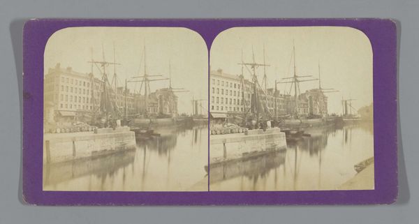 Curator: Ah, another beautiful albumen print to contemplate! This one is Charles-Henri Plaut's "Gezicht op de Nieuwehaven in Rotterdam," created in 1858. What's your immediate impression? Editor: Well, it feels like looking into a sepia dream. The masts of the ships create this incredible forest of verticals, a stillness, and there is just this hazy calm over everything. Curator: Hazy calm, yes! That's the atmospheric perspective working its magic, absolutely aided by the subtle tonal range. Notice how Plaut has skillfully used the depth of field to suggest the expansive space of the harbor. The dark foreground, with its detailed ships, draws you in, doesn't it? Editor: Definitely. There is a powerful contrast too: those dense buildings, emblems of Rotterdam's prosperity, against the delicate rigging. It is almost architectural. It looks almost like a deliberate contrast. I’d love to hear about the compositional intention there. Curator: Precisely. It's not just a record of a place, it's a carefully constructed image. Consider the repetition of the masts, that almost mathematical arrangement; this reinforces the formal grid structure, creating this amazing rhythmic pattern against the solid mass of the buildings. The semiotics give it structure. What I mean is, it uses structural elements, if I might be so bold as to put it, as almost symbolic elements. Editor: That grid gives a nice stability. Thinking about that dreamy effect, I do wonder about the longer exposures necessary in early photography. Were they aiming for such ethereal results, or was it simply the nature of the process? Did they try to counter those aspects? Curator: Interesting point! My feeling is that in a piece like this, artists recognized and embraced the ethereal, the dreamy qualities of the medium. Photography in 1858 wasn't just about capturing reality—there's artistic license there, I reckon! The lighting isn’t purely documentarian in the photograph as an object, that is, so much as creative, almost expressionist in a muted sense. It is definitely an expression of space. Editor: So, less concerned with pure representation, more with using the technology to capture atmosphere? That really does shift how we interpret the work. A deliberate decision to enhance a feeling, not just reflect what was. Curator: Exactly! And it's the layers of meaning, both formal and emotional, that continue to fascinate me about this unassuming albumen print. Editor: Yes, and for me, it is really a gentle nudge towards pondering what the city really stood for back then.