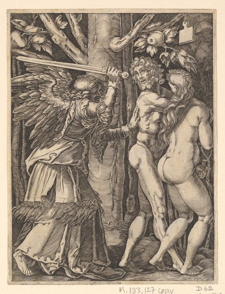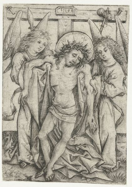 This delicate print, *The Adoration of the Trinity*, was made by the Master of the Amsterdam Cabinet using drypoint, a printmaking technique. A sharp needle is used to scratch directly into a copper plate; the resulting burrs create a soft, velvety line when printed. The artist’s skill is evident in the intricate detail achieved through the drypoint method. Notice how the burr catches the ink, creating a rich, textured surface. This contrasts with the crisp lines that define the figures of Christ, God, and the surrounding angels, creating subtle tonal variations that give depth to the composition. The artist masterfully utilizes the medium to evoke a sense of reverence and divine presence. It's important to remember that, even in this spiritual scene, labor is involved. The artist’s careful hand, guided by a specific set of skills, brings this vision to life. Appreciating this print means recognizing the work, skill, and tradition that shaped its creation.
