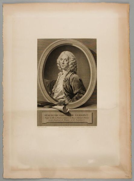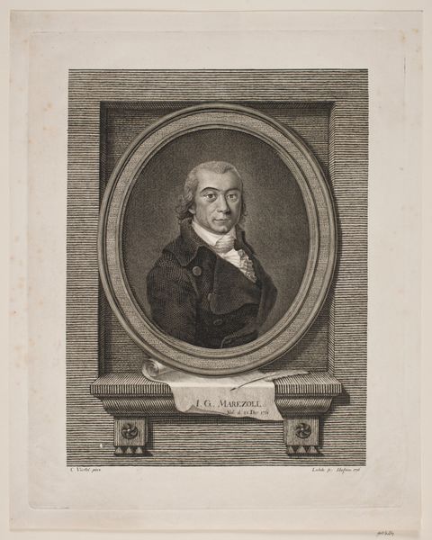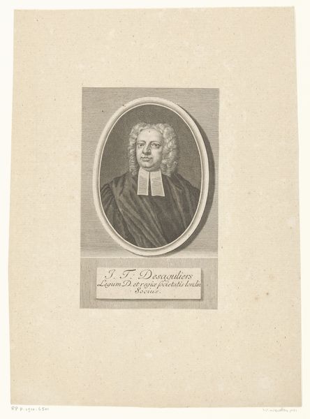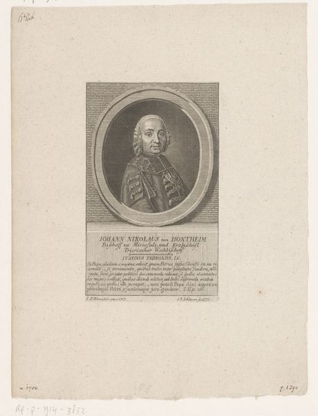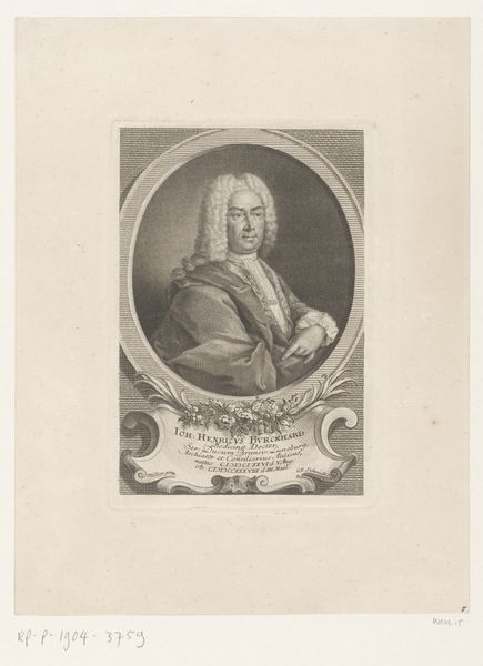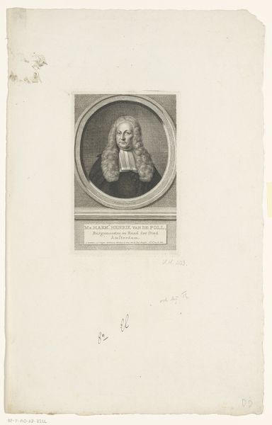 Curator: This is a portrait of Daniel Nebel. Created sometime between 1710 and 1781 by Georg Lichtensteger, it's an engraving now housed in the Rijksmuseum collection. Editor: My initial thought is one of formal authority. There's a starkness to the black and white rendering, yet the subject’s gaze is rather self-assured. It speaks to the socio-political power of the subject depicted. Curator: Indeed. As a print, it likely circulated widely, shaping Nebel’s public image and solidifying his position within society. Engravings such as this allowed for the dissemination of particular ideologies. Editor: The use of line, particularly, stands out. It has such directness, and how the portrait is situated in a frame on what seems to be some sort of architectural block emphasizes the formal intent behind the work. What can we understand of the Baroque style expressed in this work? Curator: It's evident in the ornamentation. And the overall composition evokes that era through its detailed approach. The history of portraiture at this time very often reflected the power structures of that society. Likeness as legacy, to be sure, but also to shape how this individual would be remembered. What could the presence of those written words mean, situated just below the main portrait? Editor: Ah, an excellent point. Inscriptions of this sort functioned much like the symbolic objects included within painted portraiture of the period. I think these added an element of context and promoted dialogue with audiences, particularly educated or influential audiences. Curator: A powerful individual, carefully and skillfully presented for public consumption through printmaking. So interesting to see that tension expressed across its themes and materiality. Editor: I find it fascinating to unpack how power is embedded even in these seemingly straightforward portraits, subtly reinforcing social hierarchies.