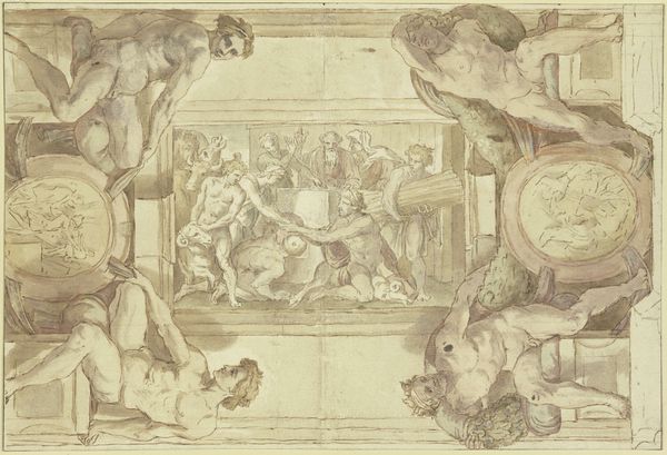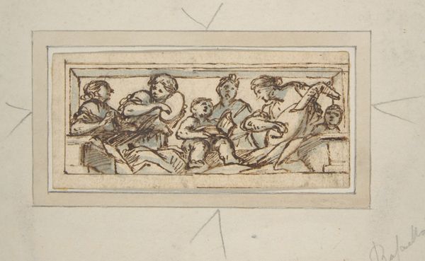 Carlo Marchionni made these four sketches of putti hanging coats of arms, in pen and brown ink with gray wash, as preliminary ideas for a larger project. These drawings are visual codes of power, status, and lineage in 18th century Italy. The images evoke the grand tradition of heraldry, where family emblems became potent symbols of authority. Each sketch presents variations on how a coat of arms might be displayed, often attended by putti – those chubby cherubs, symbolizing innocence and divine favor, who were frequently commissioned by institutions such as the Catholic Church. The inclusion of animals such as lions and dogs may be a reference to family names or traits such as nobility, courage, and loyalty. To truly grasp the importance of such imagery, we might delve into period documents, such as family records and institutional archives. These could help us unpack the social dynamics at play. Ultimately, the power of art lies not only in its aesthetic qualities but in the web of social and institutional relations it reflects and reinforces.