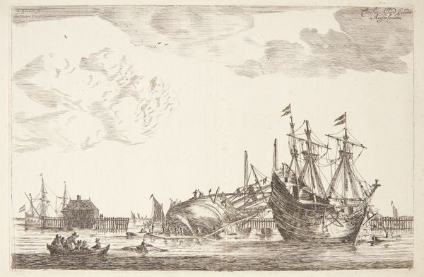 This anonymous engraving from 1653, titled "Driedaagse Zeeslag," captures the intensity of naval conflict through its intricate, monochromatic lines. The composition is dominated by the chaotic arrangement of ships amidst billows of smoke, a stark and immediate evocation of battle. The artist uses a complex interplay of lines to delineate each vessel, creating a textured surface that animates the scene. This density of detail draws the eye across the expanse of the sea, mimicking the dynamic, decentralized nature of naval warfare. The arrangement dispenses with traditional perspective, flattening the field of battle and emphasizing the sheer number of combatants involved. The portraits in each corner act almost as a cartographic key, framing and ordering the image, but also disrupting the depth of the naval scene. Through these formal choices, the engraving not only depicts a historical event, but also challenges the viewer to engage with a complex, multi-layered representation of maritime power.