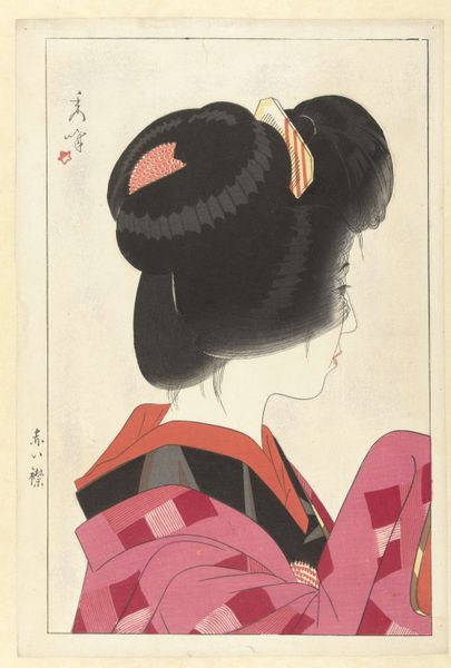 Editor: So, this is Ito Shinsui’s "Snowy Night," from 1925. It's a woodblock print, and I find the colors muted yet vibrant all at once. What strikes me is the emphasis on the textile patterns, how do you interpret that? Curator: Well, looking at it through a materialist lens, the focus shifts to the very means of its production and the consumption it depicts. Ukiyo-e prints, though often celebrated as fine art now, were produced using multiple blocks, requiring collaboration between artist, block carver, printer, and publisher, and were often more commercial in nature. The emphasis on the textiles is not just aesthetic. Editor: Interesting, could you elaborate? Curator: The intricate patterns showcase the skill involved in textile production and consumption, reflecting the burgeoning consumer culture of the Taisho era. Note the details – the precise registration of color in the print. This speaks to skilled labor and technological development of the period. Where does the 'high' art truly lie; the skill of the artist, the laborer involved, or the patron of art? Editor: So you are suggesting the print is a statement about art and commerce? Curator: I would say, it acknowledges their inseparability. Consider also that these prints, in their time, blurred the boundaries between high art and craft, between the studio and the marketplace. Who benefitted from the original production? Who consumes today? Editor: That is insightful! I never really thought of ukiyo-e prints in terms of labor and material culture, focusing instead on the more romantic notions of beauty, class, or social commentary. Curator: It is all interconnected! By examining the materials, production processes, and consumption patterns associated with this woodblock print, we gain a more comprehensive understanding of its place in the social and economic landscape of its time, challenging assumptions on both art and the processes of art making.