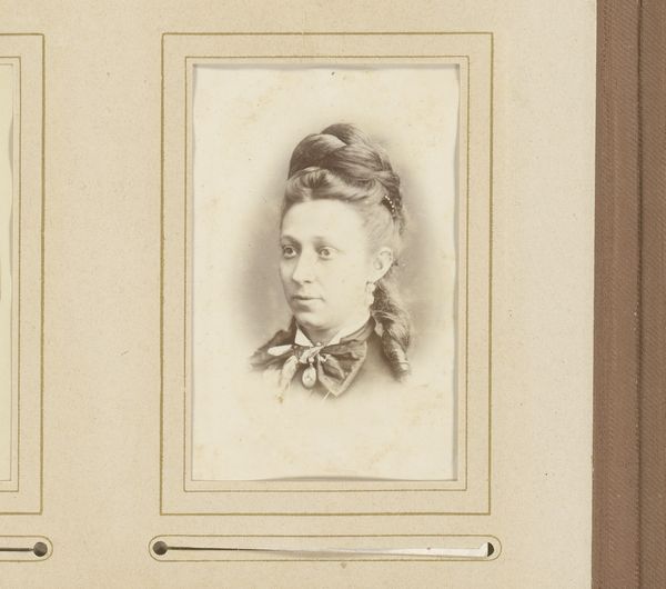 Curator: Albert Greiner's "Portret van een vrouw met lange ketting," a photograph dating from between 1861 and 1874, captures its subject with a somewhat melancholy air. What are your initial impressions? Editor: Yes, I immediately noticed that melancholy! There's a stillness to her expression, and to the image generally. The lighting, the framing… everything seems to converge, inviting questions of class and visibility, especially given the limitations photography imposed on early sitters. Curator: Indeed. Note how the long chain, the central motif of the portrait, acts almost as a plumb line, vertically dividing her. The weight of adornment mirroring perhaps an internal stoicism? Greiner’s strategic deployment of vertical lines in her clothing works as counterpoint. Editor: And look closer at the chain. How is this item signaling social status during this era? Its presence or length wouldn’t have been arbitrary; each detail implies layers of societal constraints or privileges dictated by gender roles at the time. Curator: Certainly, we see her poised elegance reflected in the structured layers. The tonal range, almost monochromatic, restricts and unifies our focus to minute changes in the textural gradations, emphasizing light, pattern, and volume. The subdued palette allows the nuanced rendering of textiles to come alive. Editor: Exactly. These textiles do more than offer a background; their patterns whisper stories—are these merely embellishments, or are they codes for communication that further place the subject inside historical contexts regarding, say, economy or personal background? Also, I can't help wondering if Greiner intentionally evokes something akin to "absent presence” given such posed precision during photography’s developing phase. Curator: Her steady gaze directly at the viewer constructs another relational complexity – it speaks to engagement within restricted codes: performative access or resistance. Editor: This encounter raises so many thoughtful reflections that blur any clear distinction regarding public versus private, even within such formally structured confines, particularly considering how that plays against our evolving cultural expectations then… and now. Curator: Precisely! Each line, tone, detail, provides fodder to deconstruct prescribed aestheticism with subjective histories layered throughout photographic technology that shape identity perception at all points during visual exchange—intriguing discourse between us even here within such rigid boundaries imposed then…and lingering always now… Editor: It's this intersection where history interacts inside artistry where deeper understanding of lives either lived, or imaged, allows each viewer insight towards better navigating futures both visible or, often times perhaps…just implied.