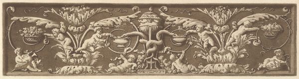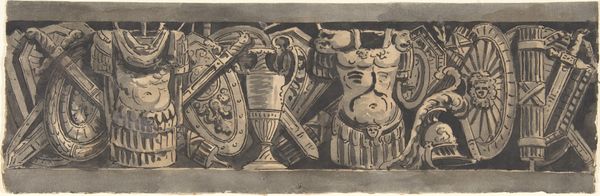 This is a design for a frieze with Roman trophies, made by an anonymous artist with pen and black ink, with gray wash. The frieze showcases a collection of military trophies, including shields, weapons, armor, and other symbols of conquest and power. The design evokes the grandeur and authority of ancient Rome, a period often romanticized. It invites reflection on the public role of art, particularly its capacity to shape perceptions of power, history, and national identity. Consider the visual codes present. The choice of Roman imagery is a conscious reference to a specific cultural and historical context, where military might and imperial expansion were central to the state's identity. Researching the historical uses of Roman symbols in different eras and nations can reveal how this classical imagery has been deployed to legitimize various political agendas. The very act of creating this design points to the enduring legacy of Rome and how its visual culture continues to inspire and inform artistic creation.
