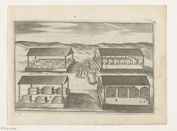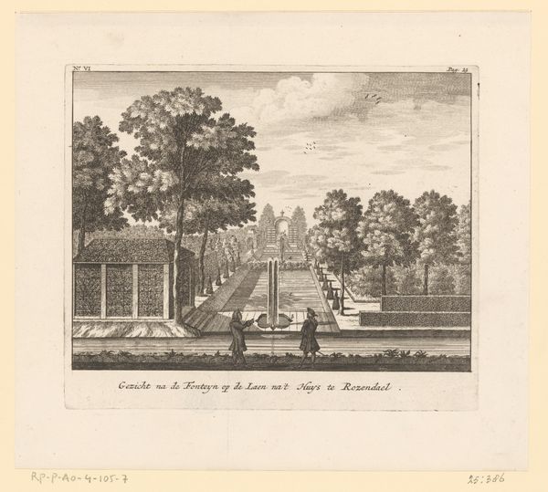 Editor: Here we have "View from Castle Rosendael" by Jan Smit, from 1718. It's an engraving. What strikes me is how… staged everything feels. The garden is almost like a tiled floor. What do you see in this print? Curator: Well, let’s think about the labor involved. An engraving like this wasn’t just about aesthetics. It was a *reproduction*, meant to circulate. How do you think the making of this image impacted ideas around landscape and ownership at the time? Editor: So, like… were these prints a way to advertise the wealth and control of the Rosendael estate? Curator: Precisely. Consider the social context. Land was power. Showing off manicured gardens, precisely ordered, displayed command over nature itself. Think about the division of labor, from the gardeners to the engraver. The print *documents* that claim. But isn't it interesting to note how artificial nature is presented through art production? What does it say about materiality of such work? Editor: I guess the print flattens out all the actual labor. It makes everything look easy and elegant. Curator: And what kind of consumption this image allowed for? Owning such an image granted symbolic entrance into certain circles and mindsets of the elites. Editor: It's a powerful perspective to think of art as documenting the structures of labor and consumption of its time. Curator: Absolutely. Looking at art through a materialist lens helps reveal how social relations and power dynamics were produced and reproduced through material objects.