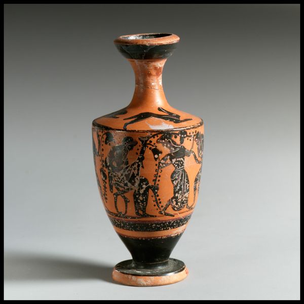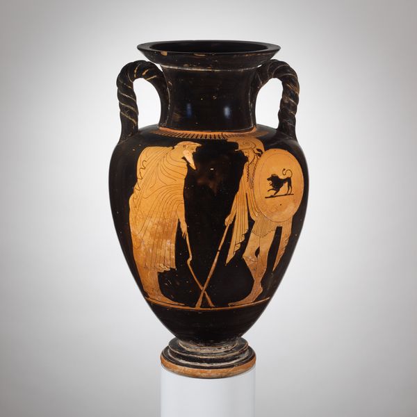 Editor: Here we have a terracotta lebes gamikos, essentially a wedding bowl, dating back to 420 BC. The figures painted on it have this wonderfully simple, elegant feel. I'm struck by the object itself, it's not just a picture, it's a thing... What can you tell me about this piece? Curator: It's fascinating how readily we separate 'art' from 'craft,' isn't it? This lebes gamikos challenges that directly. Think about the labor involved: extracting the clay, the potter's wheel shaping it, the skilled hand applying the slip to create those striking black figures. It's a process of transformation. What do you make of its function? Editor: Well, knowing it was for weddings definitely changes how I see the imagery, almost like a precursor to wedding photography, marking a significant life event. Curator: Precisely. But consider *why* terracotta? It was common, accessible. The choice of material wasn't just practical. What does it say about marriage rituals in Athenian society, where such an object, made from earth itself, played a key role? It brings the ceremony down to earth. Not something precious and unattainable but from clay to be handled and to contain important aspects. Editor: So, even in something seemingly decorative, there’s this embedded commentary on social practices through the very materials chosen. Curator: Exactly. Think of the distribution, the potential mass production for similar rituals... each lebes gamikos bearing witness, a material record of countless unions. What stories could this single piece tell if it could speak of all the lives it has touched since then, being produced by one set of hands and then held by others? Editor: It’s interesting to think of art as this social connector, deeply woven into the fabric of daily existence. Curator: Absolutely. Next time, consider who was doing the extracting, who the mixing and painting? What was it like working in those factories? Material and its impact are critical. Editor: This has given me so much to think about – art is less about the finished product, and more about all these factors that came together for this existence. Thank you.