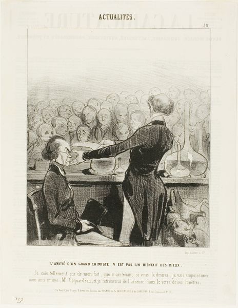 Curator: This lithograph by Honoré Daumier is titled "A Secondhand Book Dealer in Ecstasy." Editor: The expressions! It's as if they've uncovered some sacred relic. The one holding the book appears to be in a state of religious fervor. Curator: Indeed, Daumier's focus on the printed word, especially secondhand books, tells us much about the accessibility of knowledge and culture during his time. Lithography allowed for relatively inexpensive reproductions. Editor: I see echoes of the past in their faces, almost caricatures, yet filled with genuine excitement. What stories lie within that small volume they clutch so dearly? Curator: The material conditions of book production made this kind of accessible knowledge possible for wider audiences. Editor: It speaks volumes about the power of symbols and the enduring human desire for connection with something greater than oneself. It seems, that even common books can embody the sublime.