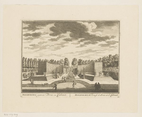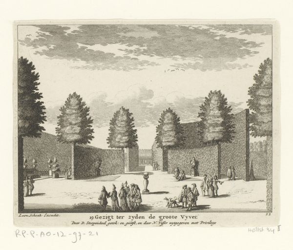 Editor: This engraving, "Fontein in de tuin van Paleis Het Loo," from around 1700 by Jan van Call, gives me a sense of formality. The sculpted hedges and classical statue in the fountain suggest a very controlled and perhaps even exclusive space. What strikes you when you look at it? Curator: I see a powerful statement about Dutch identity and power in the late 17th century. These formal gardens were not merely aesthetic; they were extensions of royal authority. Consider the socio-political context: the Dutch Republic had just emerged from the Golden Age, marked by maritime power, trade, and burgeoning colonialism. These perfectly manicured landscapes served as visual symbols of control – over nature and, by extension, over their expanding empire. Editor: So, the garden reflects control and dominion? That's interesting because at first glance, it just looked pretty and neat. Were gardens like this open to everyone? Curator: Not at all. These were spaces for the elite, designed to impress and reinforce their status. Notice how the figures are strategically placed within the landscape, carefully arranged. The arrangement signals access and privilege. Gardens became spaces for displaying power, mirroring larger social hierarchies of the era. This wasn't just about beauty; it was about demonstrating who was in charge. Do you see how the image uses the gardens as a kind of stage? Editor: Definitely, it makes you think about who had access and who didn’t. Curator: Precisely. And the engraver, Jan van Call, was likely commissioned to circulate these images, solidifying this image of Dutch sophistication and control for wider audiences both domestically and abroad. This image contributes to the palace's branding, if you will. Editor: I see that now! It’s much more than a garden view; it’s a political message cleverly disguised as a beautiful scene. Curator: Exactly. The political intent of imagery cannot be discarded in Baroque Art. Always consider audience and the artist's intent within sociopolitical environments!