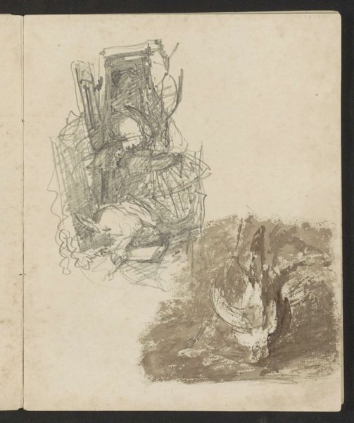 Curator: Welcome. We are standing before Maria Vos's sketchbook page entitled "Stillevens en landschappen met een toren." It's believed these drawings were created sometime between 1834 and 1906, using primarily pencil and pen. Editor: My first impression is one of tentative exploration. There's a charming intimacy here, like peering into someone's private thought process as they experiment with form and composition. The repeated towers carry a sense of almost melancholic contemplation, wouldn’t you say? Curator: Absolutely. Towers throughout art history often symbolize ambition, power, and connection to the divine. They're potent symbols, laden with collective meaning, but what fascinates me is how Vos uses the landscape elements around them. The tower vignettes are positioned in proximity to seemingly random objects like stacks of fruit and platters. Does this perhaps comment on the role and perspective of domesticity versus that of historical, social and institutional dominance represented by these tower structures? Editor: It’s a compelling read. The choice of a simple pencil sketch subverts the grandiose associations usually linked to towers, softening them, bringing them into a relatable, perhaps even vulnerable sphere. There’s also a lovely contrast in technique here. Some drawings are detailed with clear, almost architectural precision, while others feel fleeting, dreamlike. It begs the question of permanence versus impermanence. Curator: I agree. Consider how architectural structures depicted throughout the history of art like the pyramids or Parthenon, have had the distinct function of enshrining ideas in visuality. What does the casual and unfinished rendering of towers tell us about its value system? Is it intentional that the architectural symbols appear dark, gothic, and heavy with scribbles as opposed to the more ethereal depictions of still lifes? Is Vos subtly pushing against a male-dominated aesthetic canon of the time? Editor: Very possible! This fragmented nature might speak to the limited opportunities available to female artists during this period. Sketchbooks allowed space for such private studies of landscape, which in turn could provide women with a level of engagement and creative agency that were restricted. And let’s not overlook the performative and staged nature of the dominant forms of art, especially when they are symbols of state power and the role women played at the time. These pages potentially offered Vos a space of refuge, where artistic freedoms were embraced with uninhibited thought. Curator: A vital insight. In its quiet way, this page embodies resistance. It underscores not only Vos’ artistic journey but also mirrors a wider societal negotiation for visibility and creative liberation. Editor: It certainly gives you a lot to contemplate, doesn’t it? A deceptively simple collection of sketches that really opens up important questions of art, identity, and historical context.