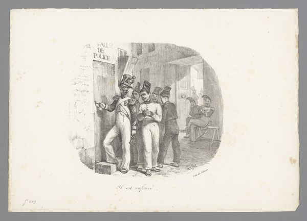 Editor: This is "Jean-Jean staat met een vrouw en kind voor een banketbakkerij" by Auguste Raffet, made between 1825 and 1829. It's an etching. It looks like a simple family scene, but something about the body language feels…charged. What do you see in this piece? Curator: I see a loaded tableau, masked as a charming genre scene. This image offers a lens into 19th-century social structures, specifically anxieties around class, gender, and race in post-revolutionary France. Look closely: What does it mean that the Black child is positioned so centrally, yet clearly exists outside the white couple's circle of intimacy and belonging? How might we read that? Editor: I hadn't thought of it that way, I just thought she was, maybe, the couple's child or being cared for by them. But, now that you point it out, she *is* slightly set apart. Is it meant to show how people of color were viewed at the time? Curator: Precisely. Raffet isn't merely depicting a family at a bakery. The image subtly underscores existing power dynamics. Notice the title "Il offre de la galette et declare sa passion," meaning "He offers a cake and declares his passion." This declaration, then, is visually framed by complex issues of race and class, subtly exposing how affection and courtship were shaped by societal norms and inequalities. It invites us to consider how even intimate gestures are tinged by larger socio-political realities. Editor: That makes me see the image in a totally different light. It's like a sweet image that is also critiquing something at the same time. Curator: Indeed! Romanticism wasn't just pretty landscapes and dramatic portraits. It could also hold space for subtle critiques of the societal frameworks that shaped people's lives, inviting viewers to question the status quo through everyday scenes. This piece is a perfect example. Editor: I’ll definitely remember to look for these hidden critiques in other Romantic works! Curator: Absolutely. Context is key to unlock hidden dialogues and untold stories.