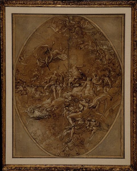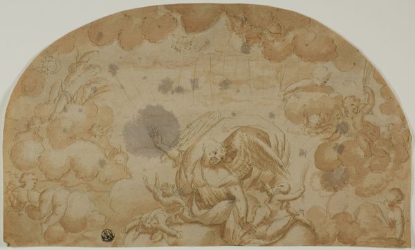 Pier Francesco Mola created this drawing, "God the Father Surrounded by Putti", likely in the mid-17th century. It’s rendered in pen and brown wash over graphite, giving it a warm, tonal quality. The composition is dominated by a circular arrangement, which immediately evokes notions of divinity and the heavens. Mola masterfully uses the circular format to create a sense of boundless space. God the Father is centrally positioned, arms spread wide, surrounded by a flurry of putti. The dynamic arrangement of figures, all caught in various states of motion, destabilizes any fixed perspective. This swirling composition isn't just visually engaging; it conceptually challenges the traditional, static representations of religious power. The use of wash enhances the drawing’s ethereal quality, blurring the lines between the figures and their heavenly backdrop. This not only softens the forms but also contributes to the sense of divine mystery. The circular structure frames a visual dialogue about the nature of representation itself. It's a reminder that art is not a mirror, but an arena for complex ideas.