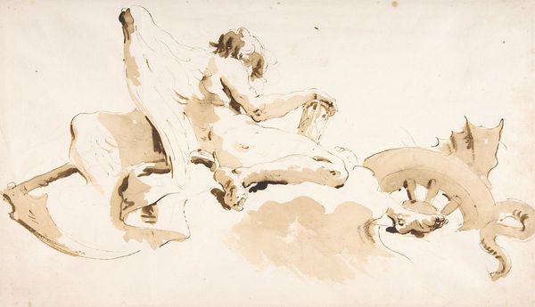 Curator: "Reclining Lady," rendered with watercolor and charcoal, is a fascinating work attributed to Giovanni Boldini, though undated. What strikes you initially about it? Editor: The composition gives an impression of spontaneity; the woman seems caught mid-motion, lost in thought, rendered with warm shades giving intimate undertones. Curator: Precisely. Looking closer, the rapid lines and use of watercolor, along with areas of untouched paper, denote its possible function as a study. There's a clear focus on the materiality of rendering flesh in a fleeting gesture. How does that contribute, in your view, to its impact? Editor: Well, in considering the social context, one can view that portrayal within the gaze of a male artist, perhaps a glimpse into private or sensual spaces typically inaccessible. How does the apparent 'unfinished' nature complicate its potential as a finished product versus an exploratory study? Curator: The sketch-like quality could be interpreted as the artist deliberately revealing the means of production; exposing the bones of a representation through the active charcoal. It highlights the choices made in representing form with certain economy. Editor: Exactly. Consider that the labor required to produce finished salon portraits also involved many invisible bodies. Could this more immediate format have challenged those norms by revealing some aspects of the means and making of that period's social construction of femininity, even if unwittingly? Curator: An astute point; considering class and consumption, Boldini created commercial pieces largely for elite clientele. This one presents the idea of process versus the glossy presentation of a constructed woman within bourgeois life, which is key to his legacy. It seems more immediate. Editor: Yes, I feel it makes an intriguing statement about femininity and power relations, not just in art historical, but in societal narratives. Curator: Indeed, seeing beyond its medium opens broader reflections regarding representation, social visibility and the role of process within production. Editor: Absolutely, viewing these subtle marks gives me much to reflect on when considering both production and its subject.