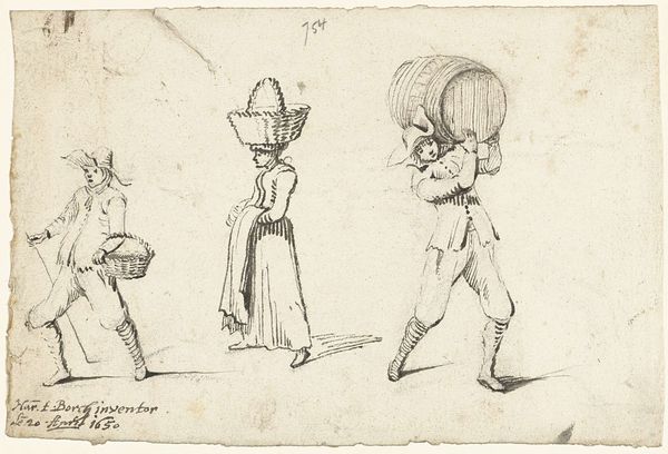 Curator: This is John Singer Sargent’s “Four Caricatures of People in Regional Costume,” held here at the Harvard Art Museums. Editor: It's a quick sketch, almost ephemeral, yet the figures are so distinctly rendered with such expressive lines. Curator: Indeed. It appears to be a graphite study, examining the construction and appearance of working-class garments, perhaps in preparation for a larger piece. The central figure, quite dapper, might have been a vendor of some sort. Editor: Observe the subtle gradations achieved with simple graphite strokes. Notice also the careful balancing of positive and negative space within each figure. The material of choice emphasizes the everyday subject, avoiding any sense of preciousness. Curator: I agree. The choice of graphite on paper underscores the socio-economic status of the people depicted. It speaks to accessibility, a medium for recording observations of labor. Editor: Ultimately, the raw technique enhances the genuineness of the observation. Curator: A fascinating exploration of how the materials contribute to our understanding. Editor: Yes, it gives new perspective to Sargent's wider body of work.