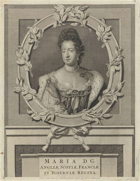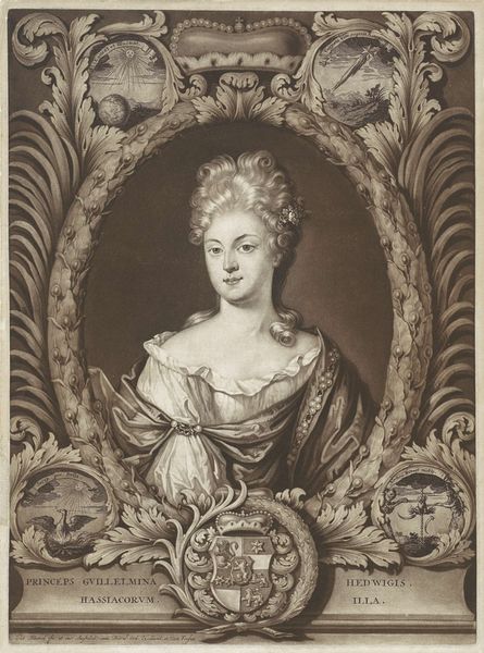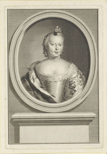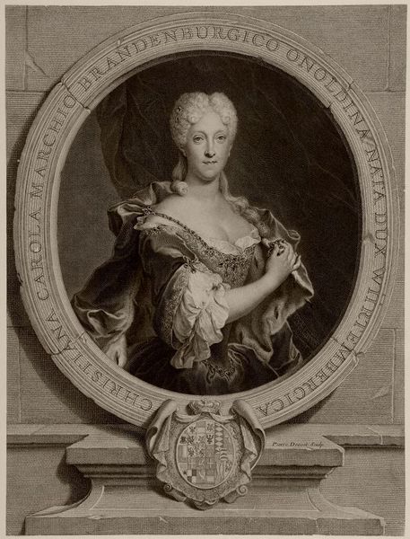 Editor: This is Johann Georg Wille's "Marguerite Élisabeth de Largillière." It's an engraving, and the detail is just astounding! The sitter seems almost dreamlike, caught in a fleeting moment. How do you interpret this work? Curator: Ah, yes! The print possesses a certain ethereal quality. Wille masterfully captures the softness of her features and the ornate textures of her clothing. Notice how the cracked oval frame adds a layer of complexity. It speaks of time, doesn't it? Almost as if beauty is eternal but the structures we create to contain it are impermanent. Editor: That's a lovely thought. It makes you wonder about the story behind the cracks, doesn't it? Curator: Indeed! It invites us to reflect on the fragile nature of existence, juxtaposed with the enduring power of art. Editor: I never would have considered the cracks in the frame as part of the story. That is such a great observation.