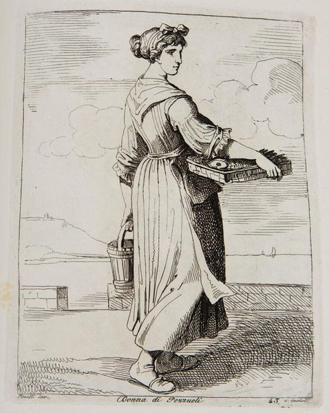 Editor: This is Bartolomeo Pinelli’s "Costumes from Tivoli," a print with no specific date, housed at the Harvard Art Museums. The women carrying loads seem to be central to the scene. What can you tell me about this print? Curator: The print's emphasis on labor and costume points us toward a consideration of social context. The very act of depicting these women as workers, burdens and all, brings into question the traditional boundaries between high art and everyday life. Editor: That makes sense. So, it's not just about the aesthetic but about representing the reality of their labor? Curator: Precisely. Pinelli captures the materiality of their existence – the weight they carry, the clothes they wear, all suggesting a commentary on social and economic structures. Do you think that the artist romanticizes or criticizes their role? Editor: Hmmm, I hadn’t considered that question! I’ll have to think more about it. Thanks! Curator: My pleasure. It's a question worth pondering.