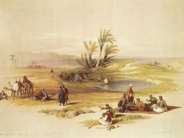 David Roberts, the Scottish painter, made this watercolor titled 'Encampment of the Pilgrims at Jericho.' Roberts, celebrated for his detailed architectural scenes and landscapes of Europe and the Middle East, produced this work amidst the surge of Orientalism in the 19th century. 'Encampment of the Pilgrims at Jericho' gives us insight into how Western artists depicted the East. Roberts wasn't merely painting a scene; he was constructing a narrative about a culture and people largely unfamiliar to his European audience. The composition evokes a sense of both wonder and perhaps a degree of exoticism. Look closely, what might seem like a neutral depiction carries the weight of colonial-era power dynamics. The scene presents an 'authentic' view of life in the East but, who decides what is authentic? The painting invites us to reflect on the complex exchange between the artist’s vision and the realities of the world he aimed to capture. It encourages us to consider how images shape our understanding of different cultures.